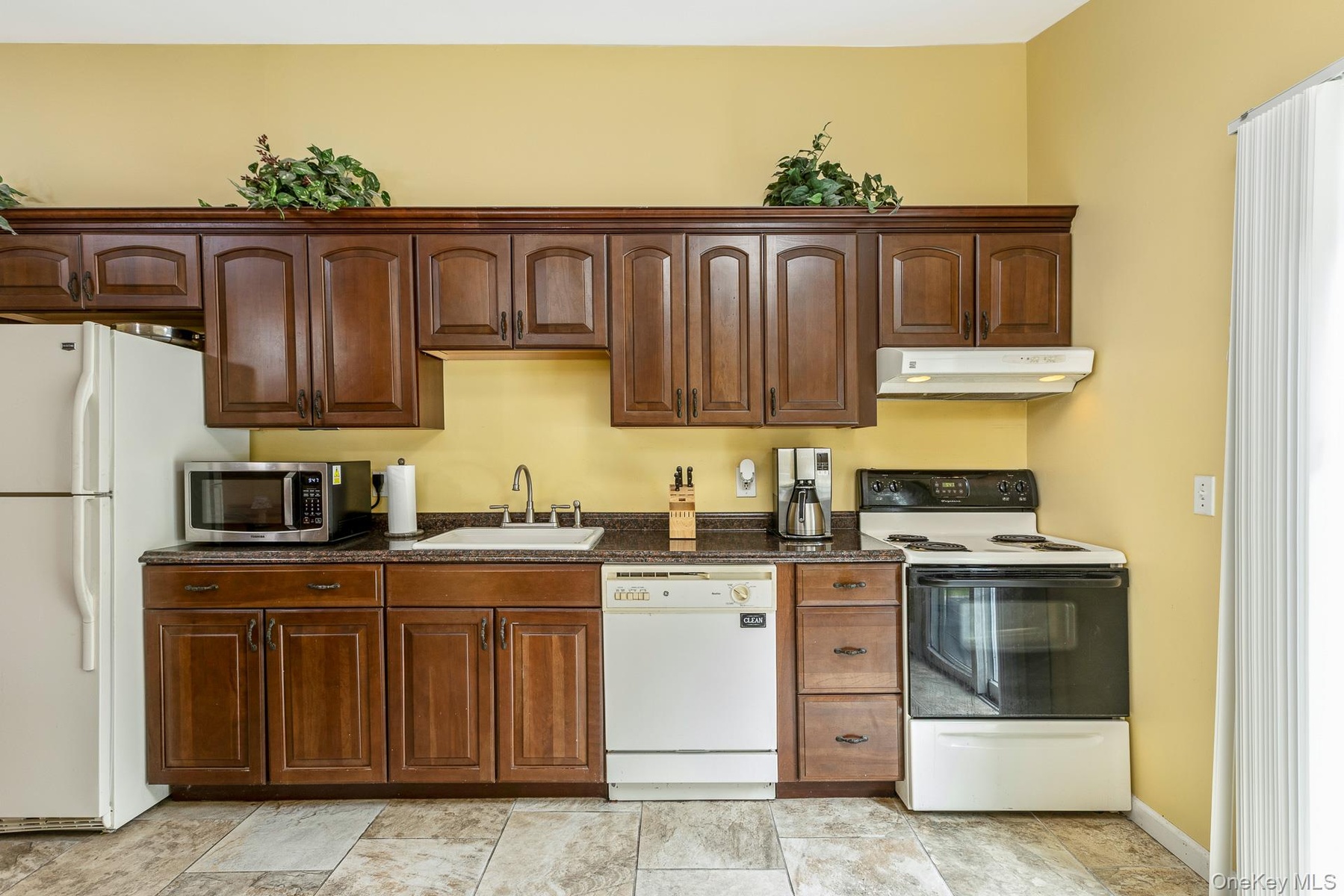 - Kitchen with white appliances, under cabinet range hood, and dark stone countertops