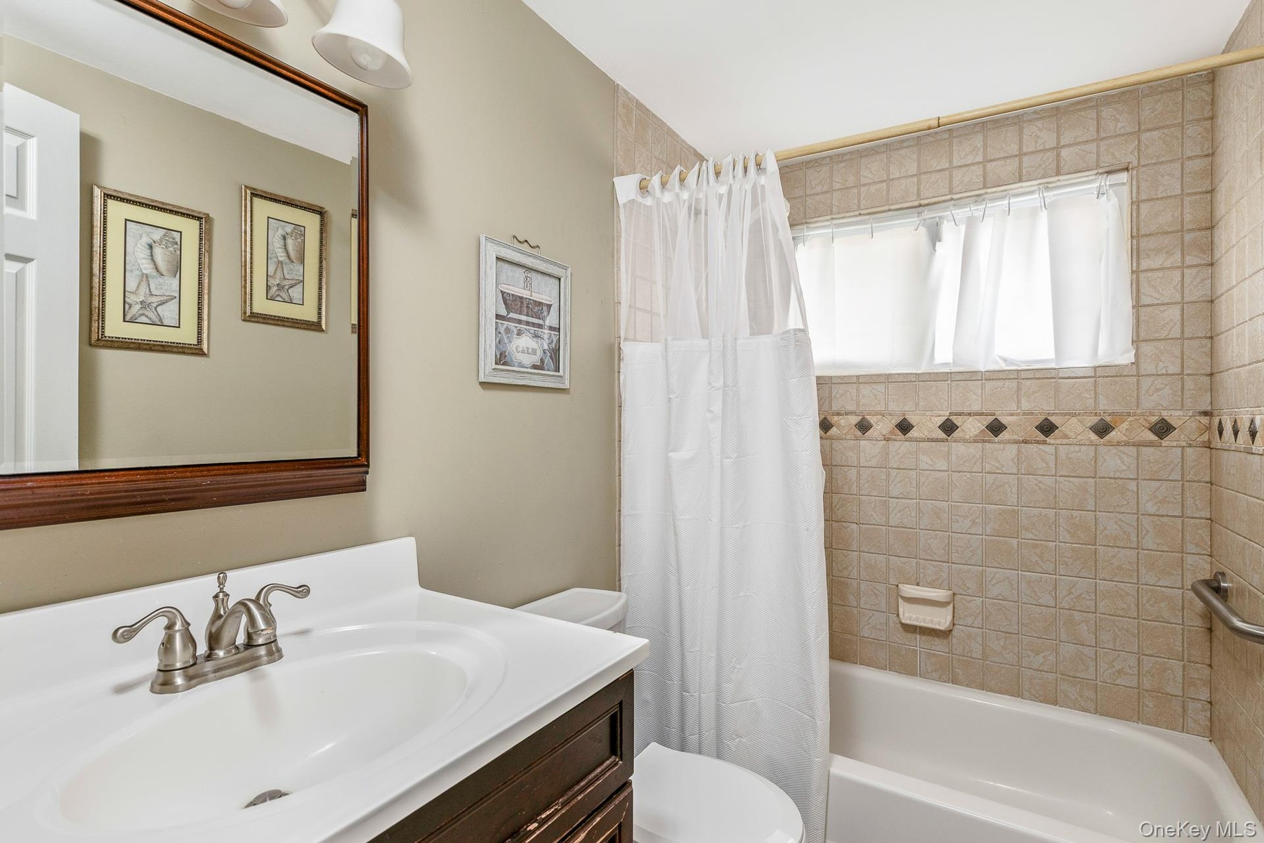 - Bathroom with vanity and shower / bath combo with shower curtain