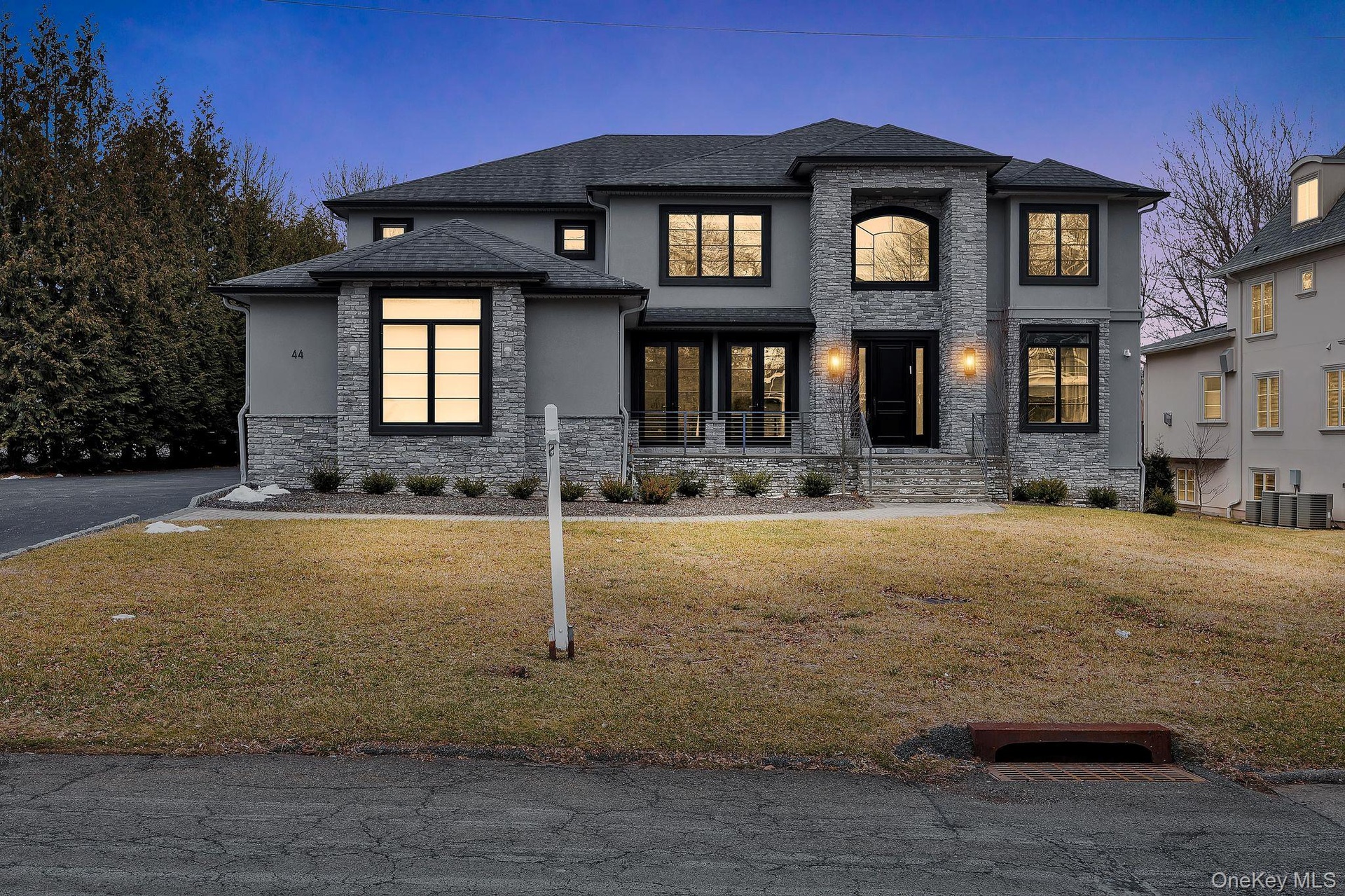View of front facade featuring stucco siding, stone siding, a front yard, and roof with shingles