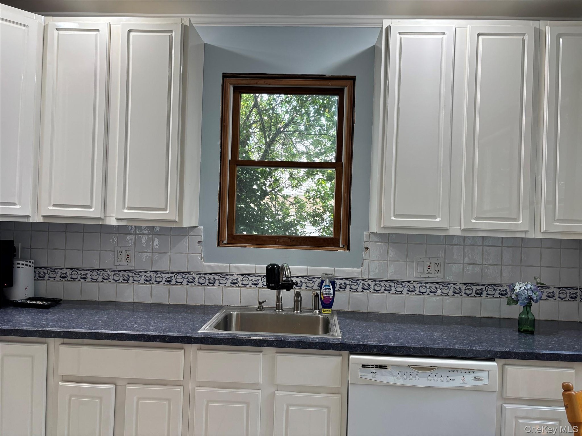 - Kitchen featuring dishwasher, white cabinets, dark countertops, and decorative backsplash