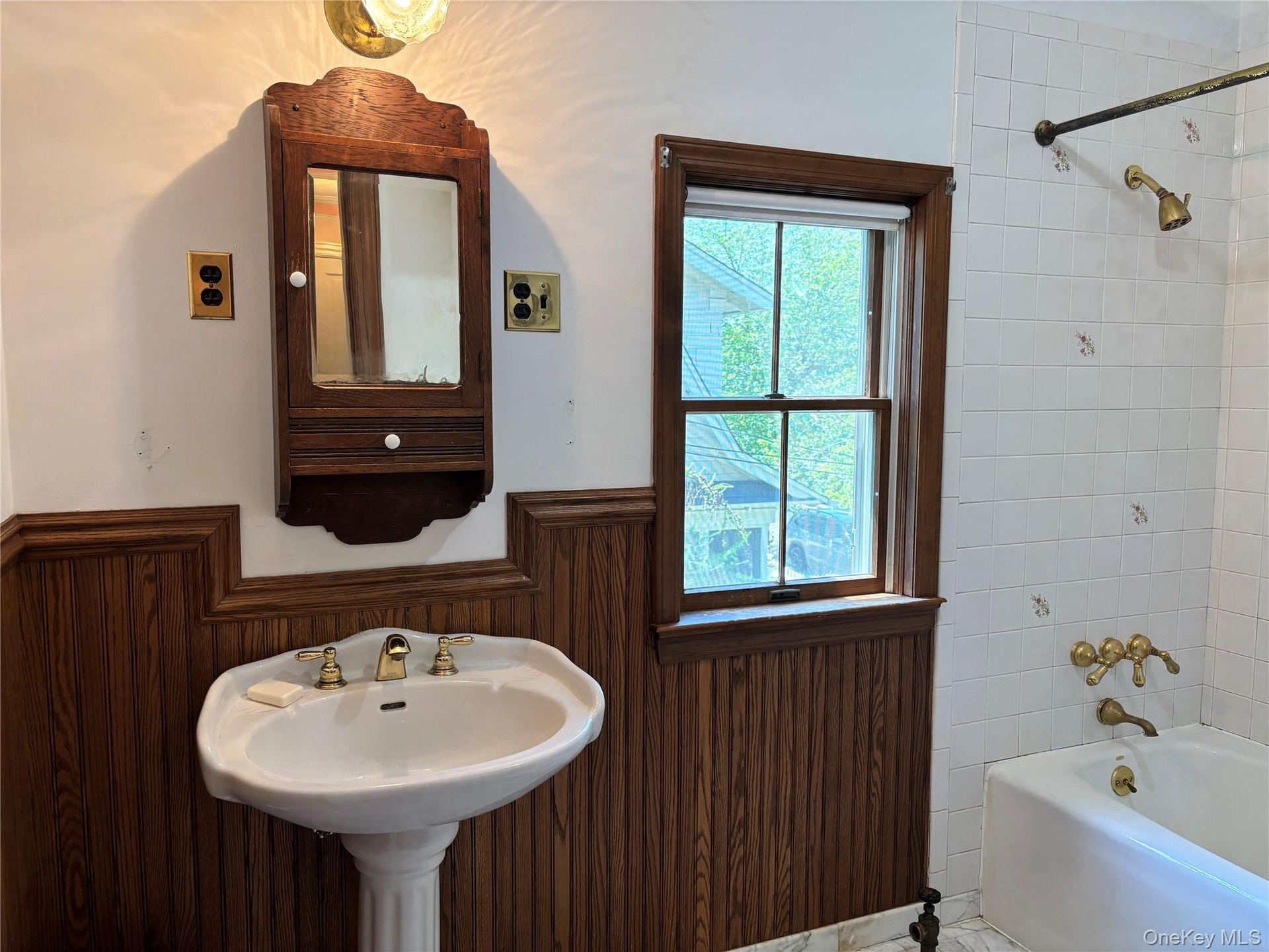 - Bathroom with bathing tub / shower combination and wainscoting