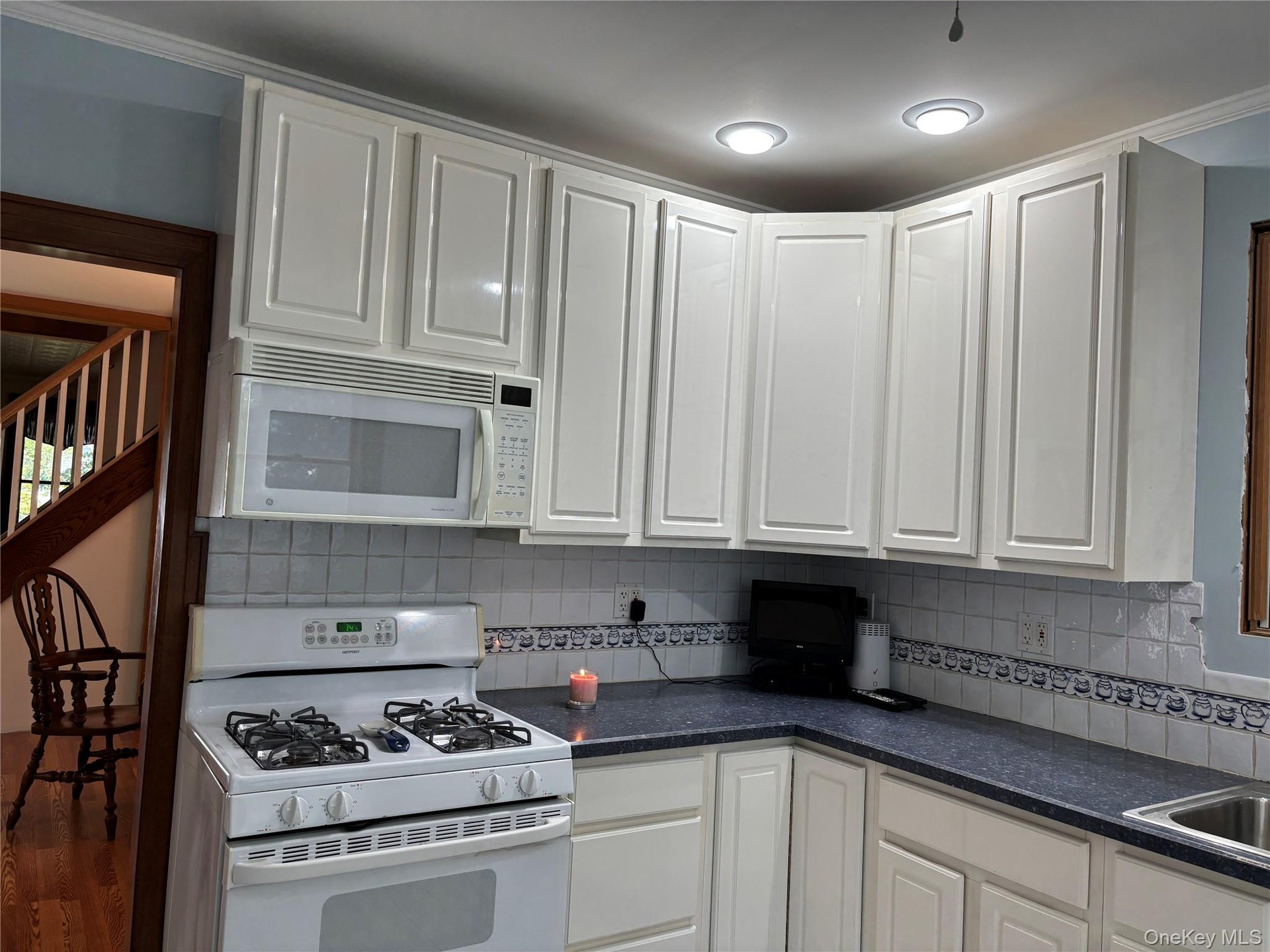 - Kitchen featuring white appliances, white cabinetry, and dark countertops