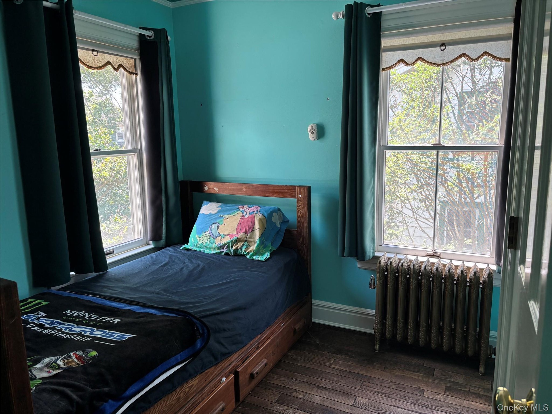- Bedroom with radiator heating unit, multiple windows, and dark wood finished floors