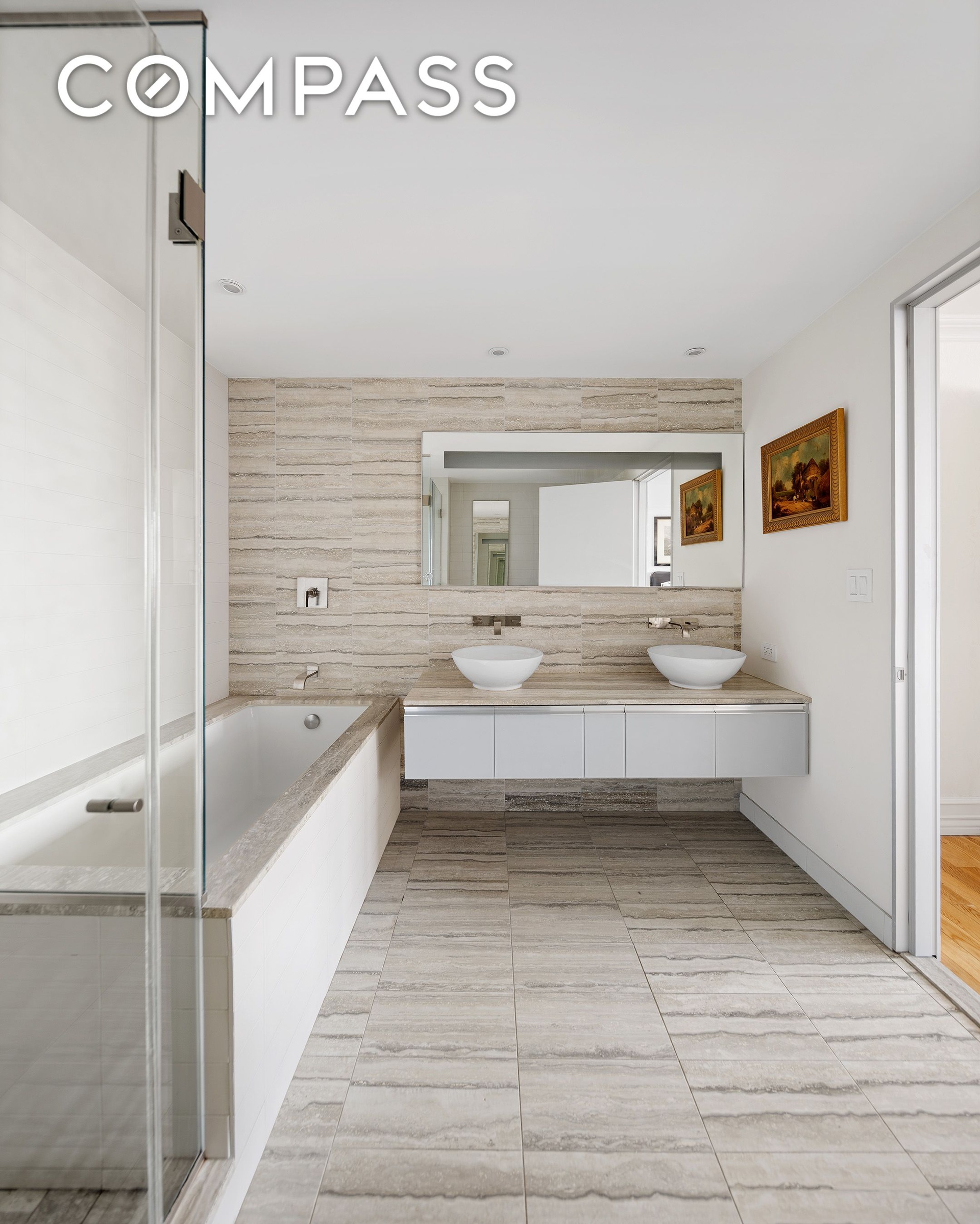 The second bedroom has been reimagined as a sophisticated home office with exquisite custom millwork. The expansive primary suite is a private retreat, complete with abundant sunlight, a generous walk-in closet, and a luxurious en-suite bathroom boasting a soaking tub and dual vanities. Additional highlights include plentiful storage throughout and in-unit washer/dryer hookups ready for installation.