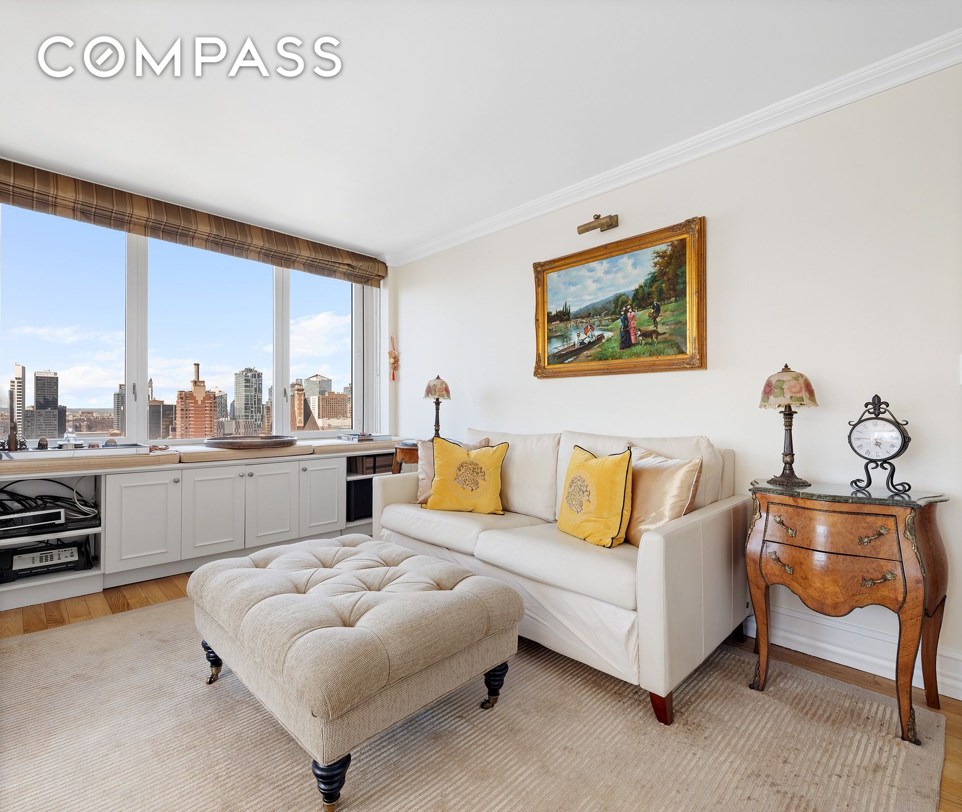 Bathed in natural light, the apartment faces south and west, offering breathtaking views of the Hudson River and Manhattan skyline. Thoughtful upgrades include detailed crown moldings, custom wall paneling, built-in cabinetry, and rich finishes throughout.