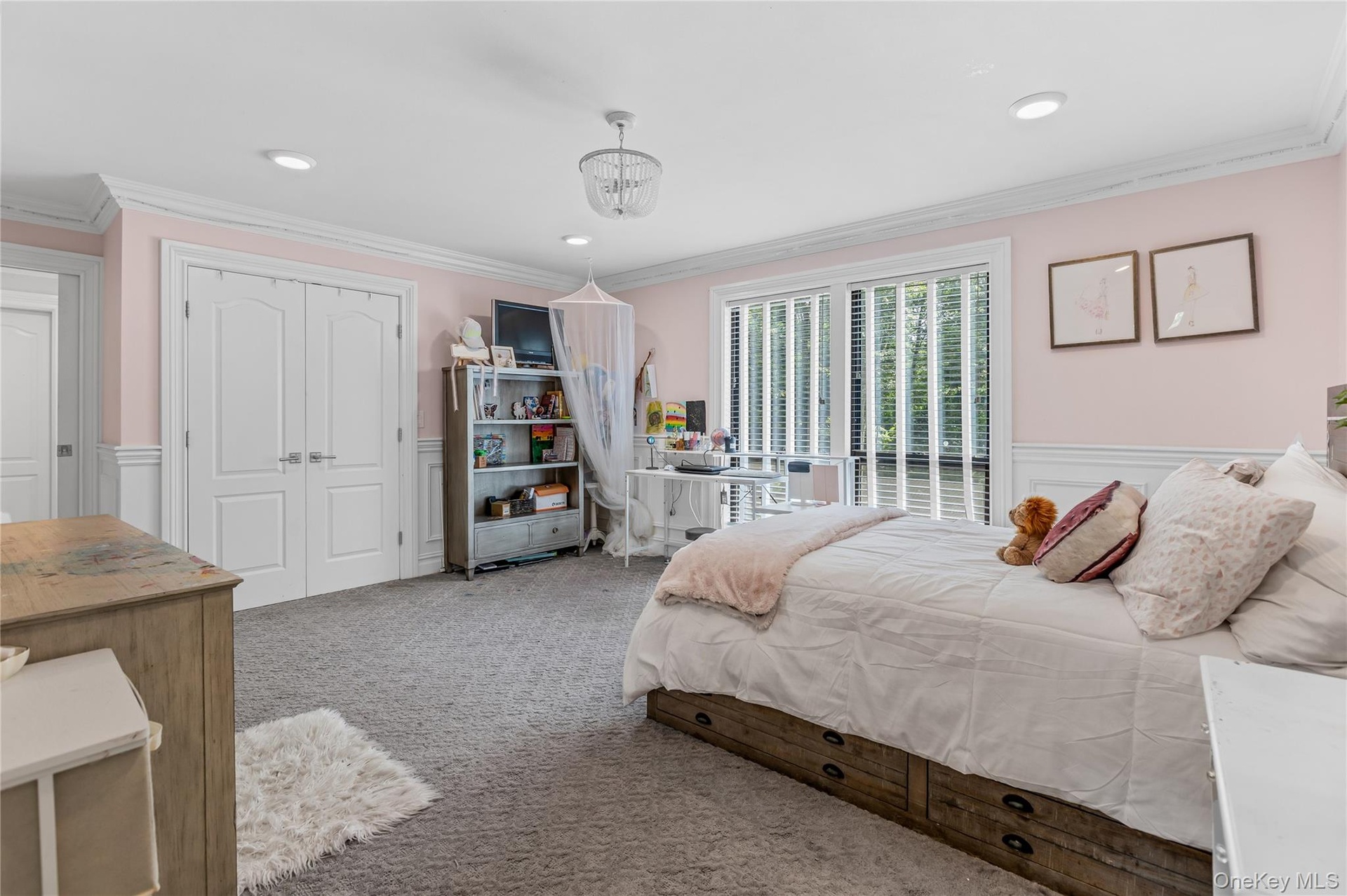 - Carpeted bedroom with crown molding, a wainscoted wall, a closet, recessed lighting, and a decorative wall