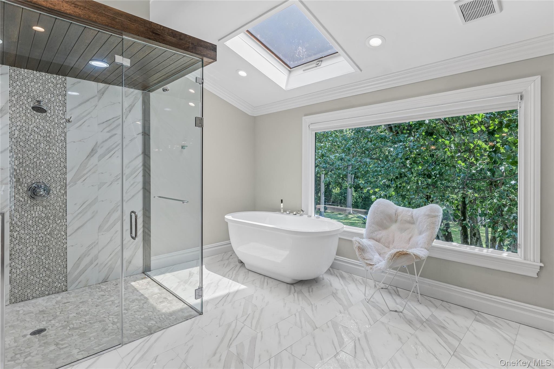 - Full bath featuring a skylight, marble finish flooring, a freestanding bath, healthy amount of natural light, and crown molding