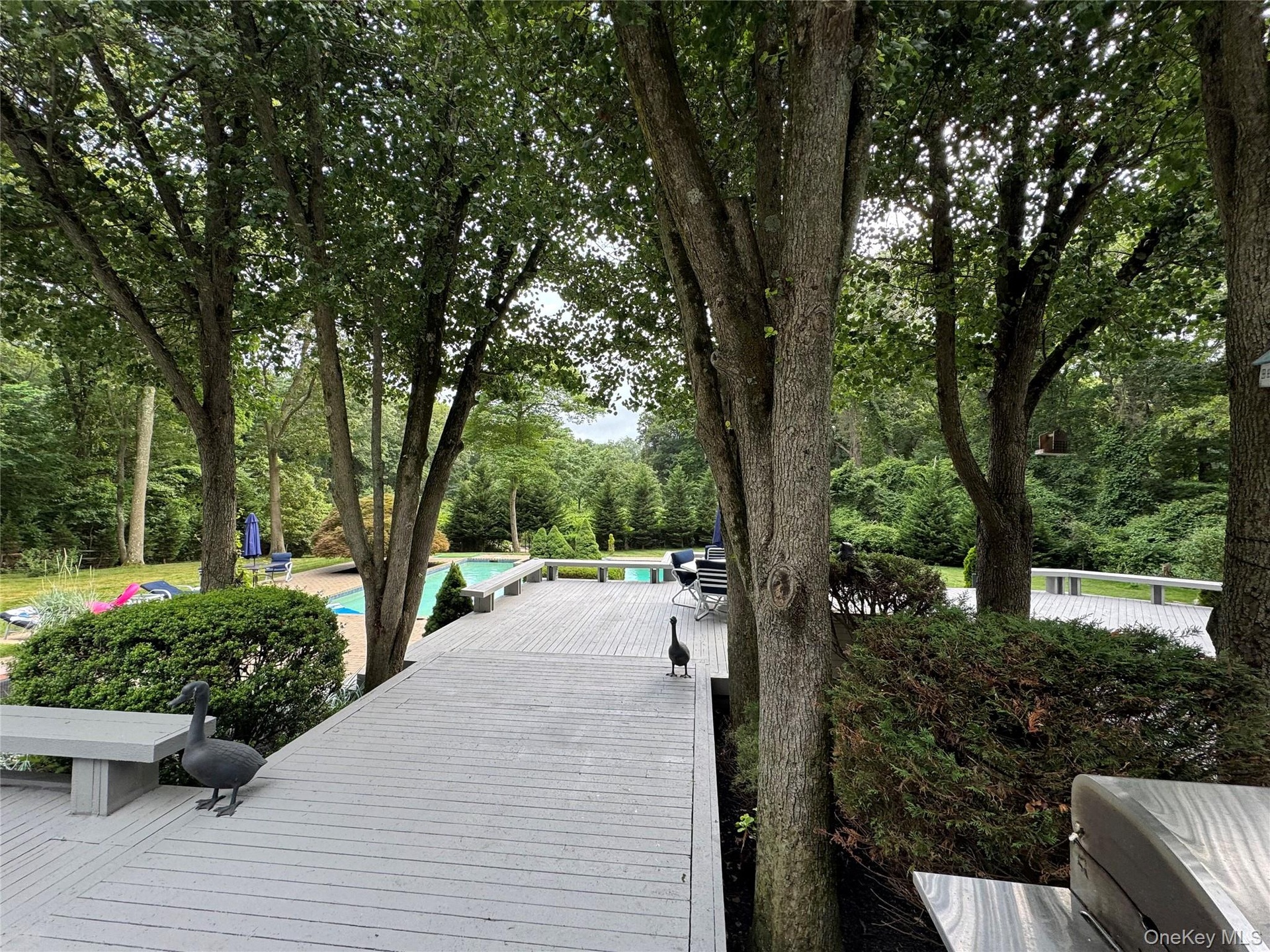 - Wooden deck featuring views of the pool, trees as far as the eye can see.