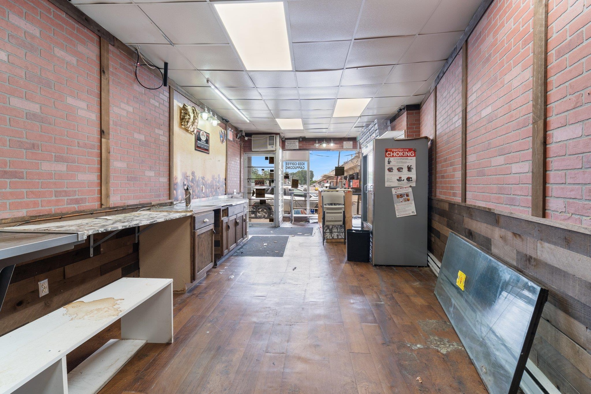 - Miscellaneous room with dark wood finished floors, brick wall, and a drop ceiling