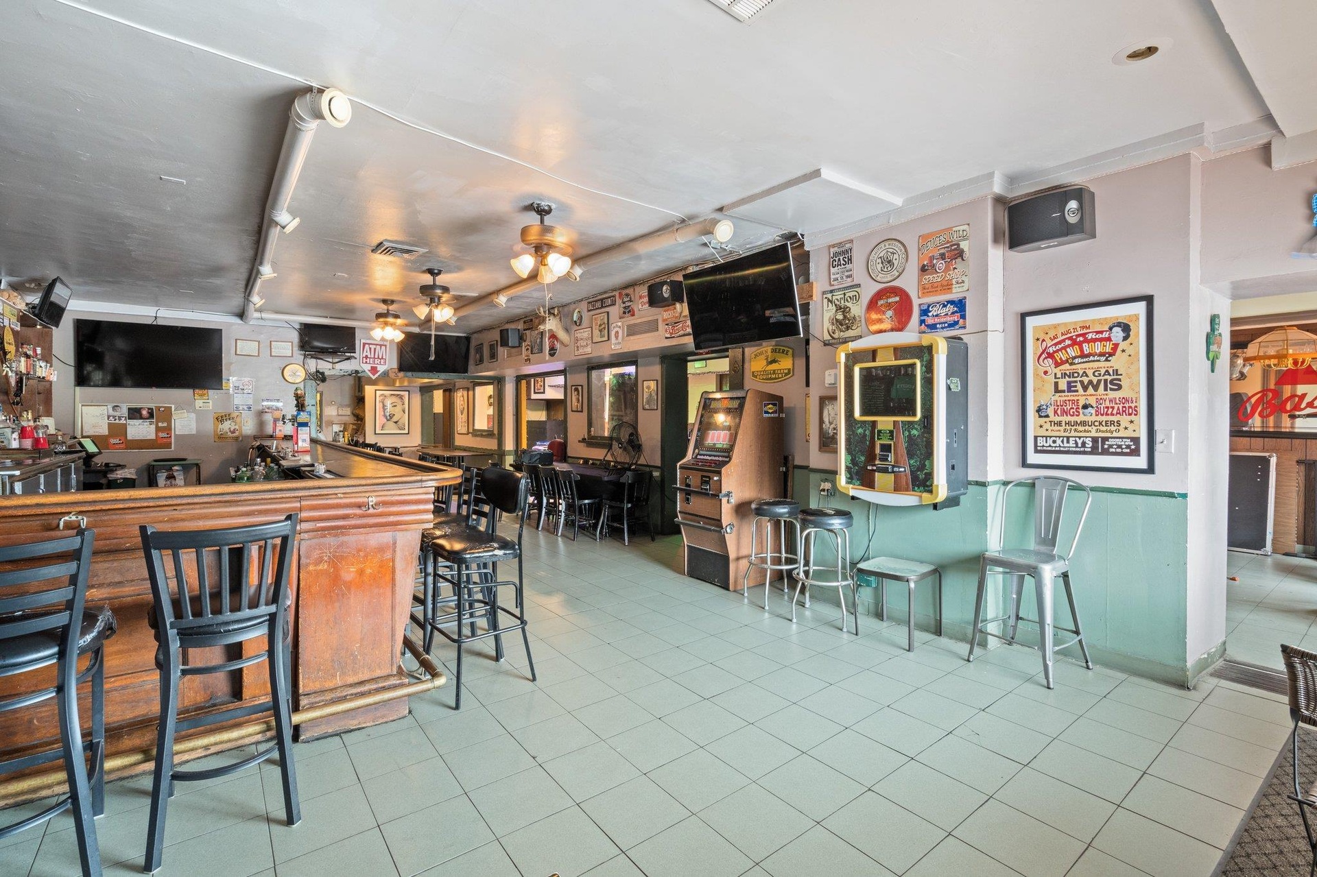 - Bar area featuring tile patterned flooring and a ceiling fan