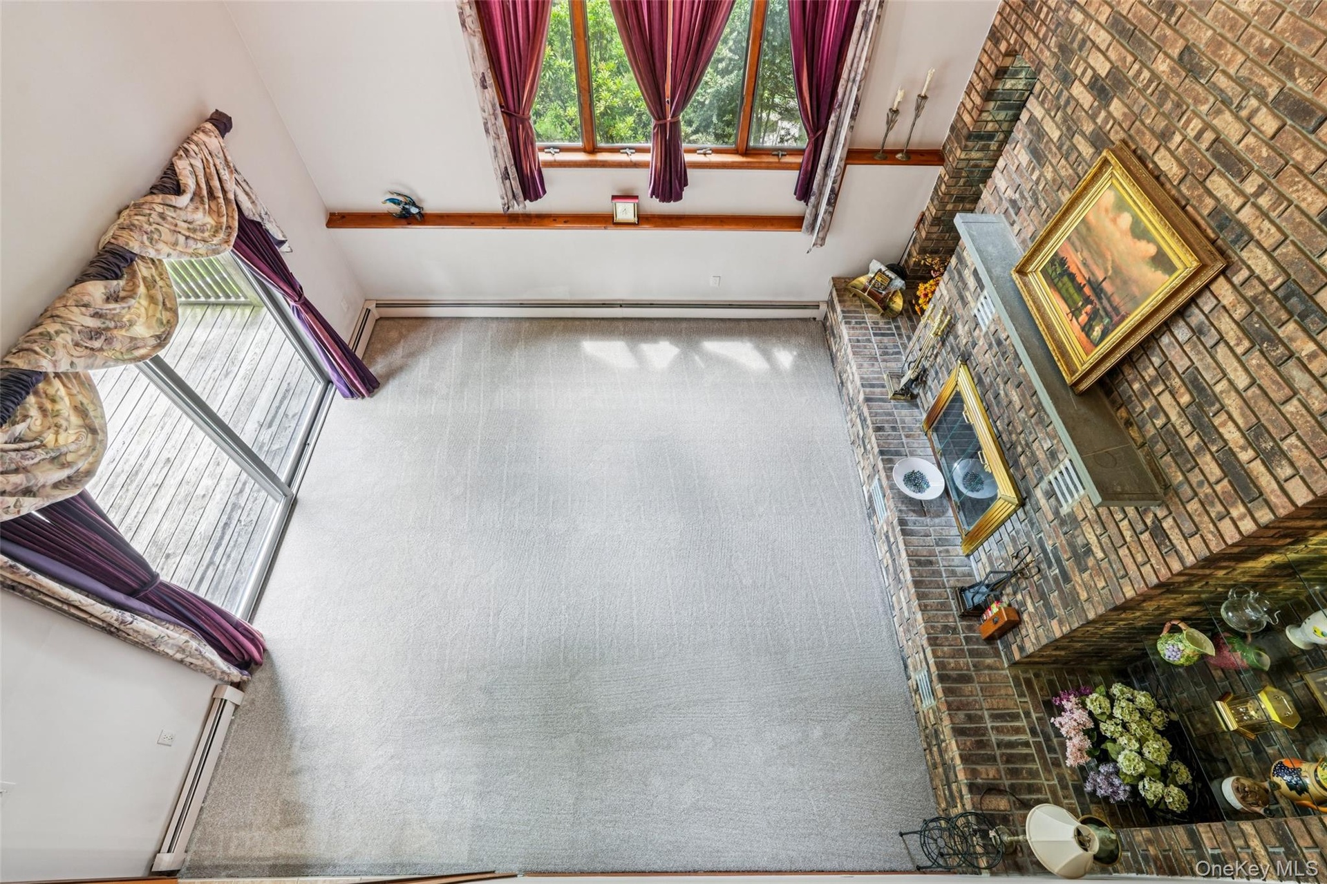 - Unfurnished living room with carpet flooring, high vaulted ceiling, beamed ceiling, a fireplace, and baseboard heating