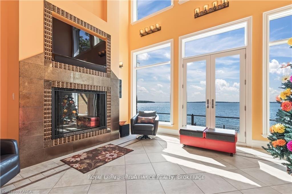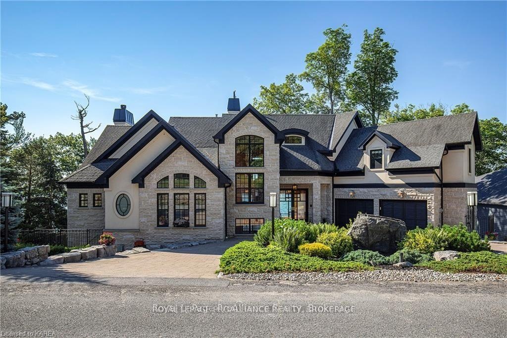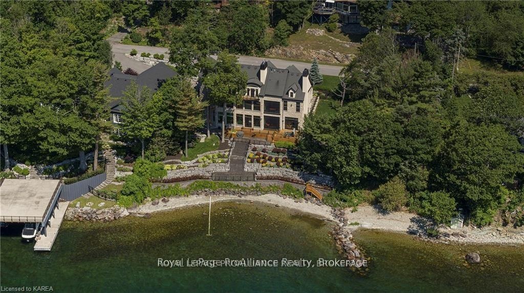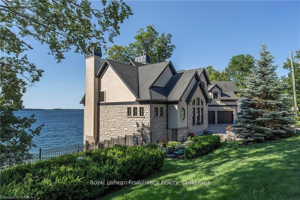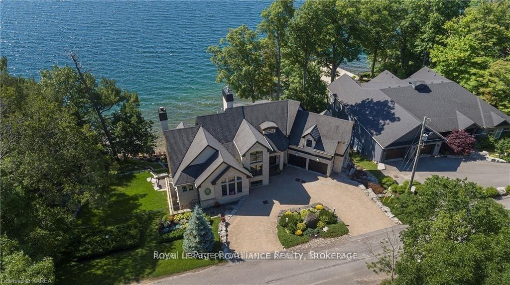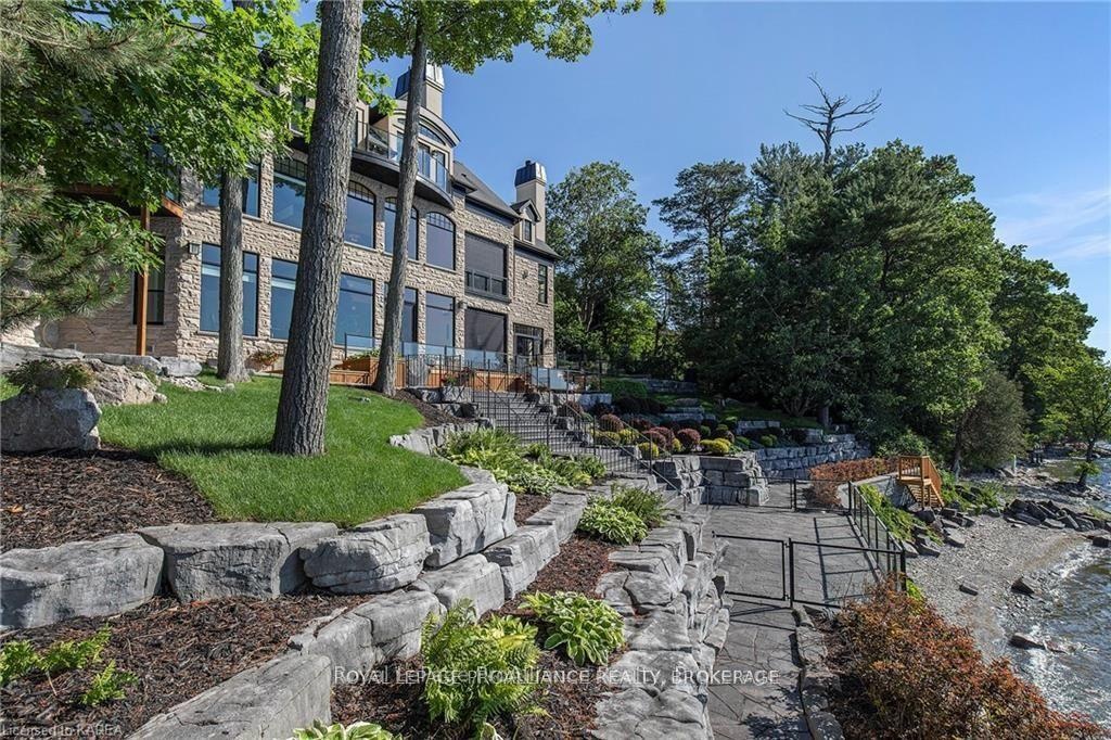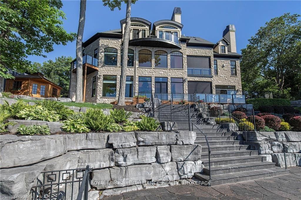 A true architectural masterpiece on the St. Lawrence River, this 4+1 bedroom, 5 bath custom-built residence offers over 6,000 sq. ft. of refined living space where every detail reflects timeless design and craftsmanship. Panoramic, south-facing waterfront views fill the home with natural light, while multiple terraces and balconies invite you to enjoy the outdoors year-round. The professionally landscaped grounds are a showpiece - meticulously designed with stone walkways, tiered gardens, mature trees, and accent lighting that create a private, resort-like atmosphere for entertaining or relaxation. Inside, the open concept main level showcases soaring ceilings and a chef's kitchen featuring Viking, Wolf, Miele, and Fisher & Paykel appliances, flowing seamlessly to elegant living and dining areas anchored by three fireplaces (one wood-burning). An elevator offers easy access to all levels, including a luxurious primary suite with breathtaking river views, a private balcony, and a spa-inspired ensuite. The main level features a billiard room. The lower level features a soundproof music room or home theatre, and fitness area. Expansive terraces with power screens capture spectacular sunrises and sunsets over the river. Perfectly located just a short walk to Treasure Island Marina and The Cove restaurant, this extraordinary property blends architectural excellence with stunning and natural beauty - offering the ultimate waterfront lifestyle.