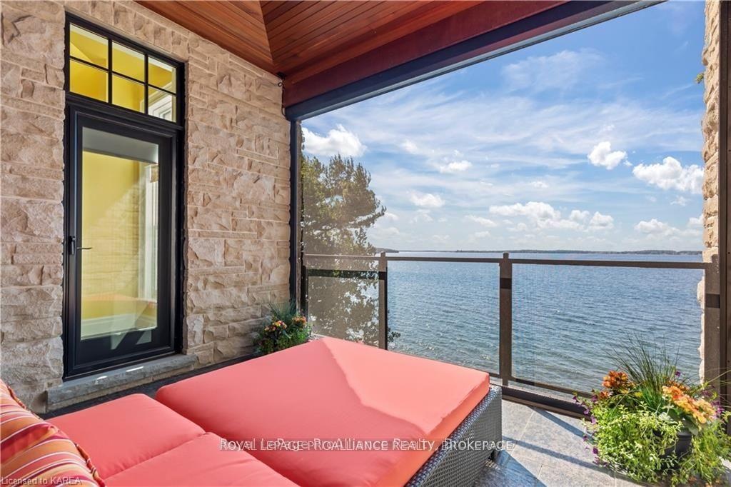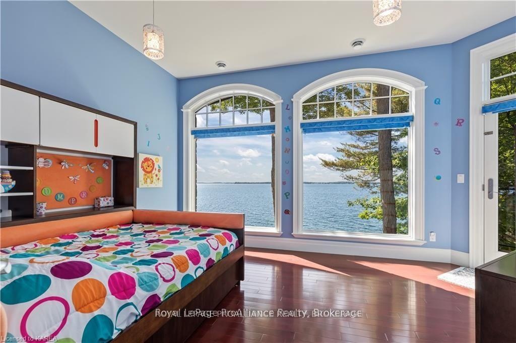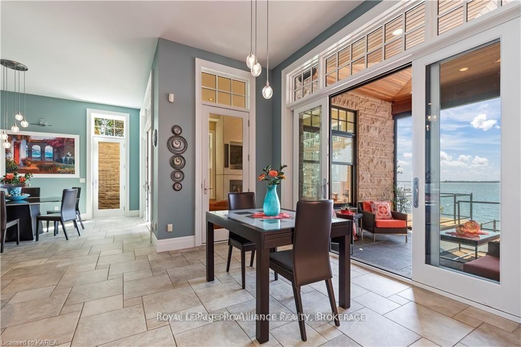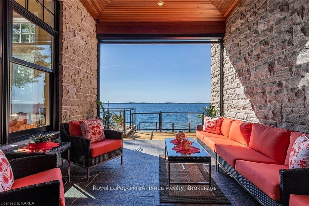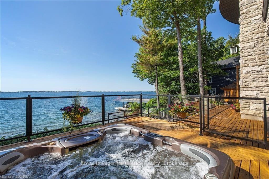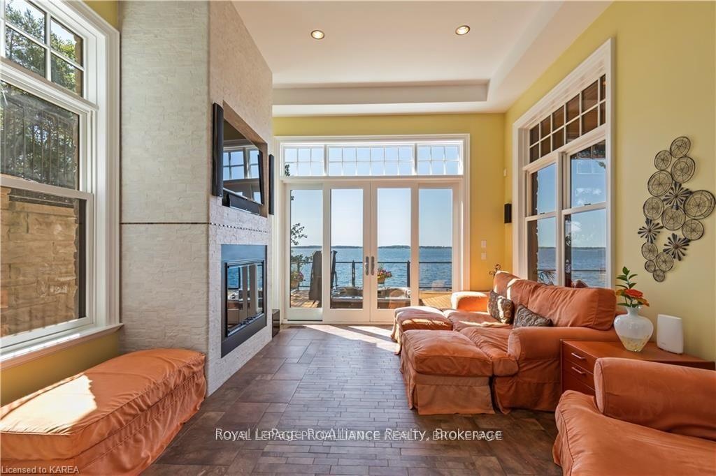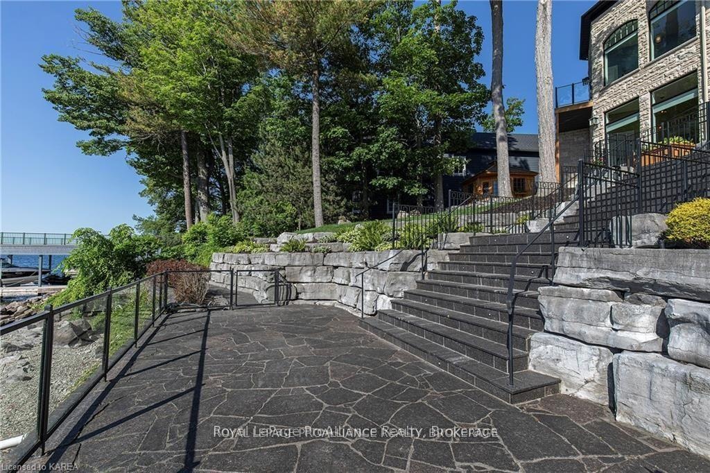 A true architectural masterpiece on the St. Lawrence River, this 4+1 bedroom, 5 bath custom-built residence offers over 6,000 sq. ft. of refined living space where every detail reflects timeless design and craftsmanship. Panoramic, south-facing waterfront views fill the home with natural light, while multiple terraces and balconies invite you to enjoy the outdoors year-round. The professionally landscaped grounds are a showpiece - meticulously designed with stone walkways, tiered gardens, mature trees, and accent lighting that create a private, resort-like atmosphere for entertaining or relaxation. Inside, the open concept main level showcases soaring ceilings and a chef's kitchen featuring Viking, Wolf, Miele, and Fisher & Paykel appliances, flowing seamlessly to elegant living and dining areas anchored by three fireplaces (one wood-burning). An elevator offers easy access to all levels, including a luxurious primary suite with breathtaking river views, a private balcony, and a spa-inspired ensuite. The main level features a billiard room. The lower level features a soundproof music room or home theatre, and fitness area. Expansive terraces with power screens capture spectacular sunrises and sunsets over the river. Perfectly located just a short walk to Treasure Island Marina and The Cove restaurant, this extraordinary property blends architectural excellence with stunning and natural beauty - offering the ultimate waterfront lifestyle.