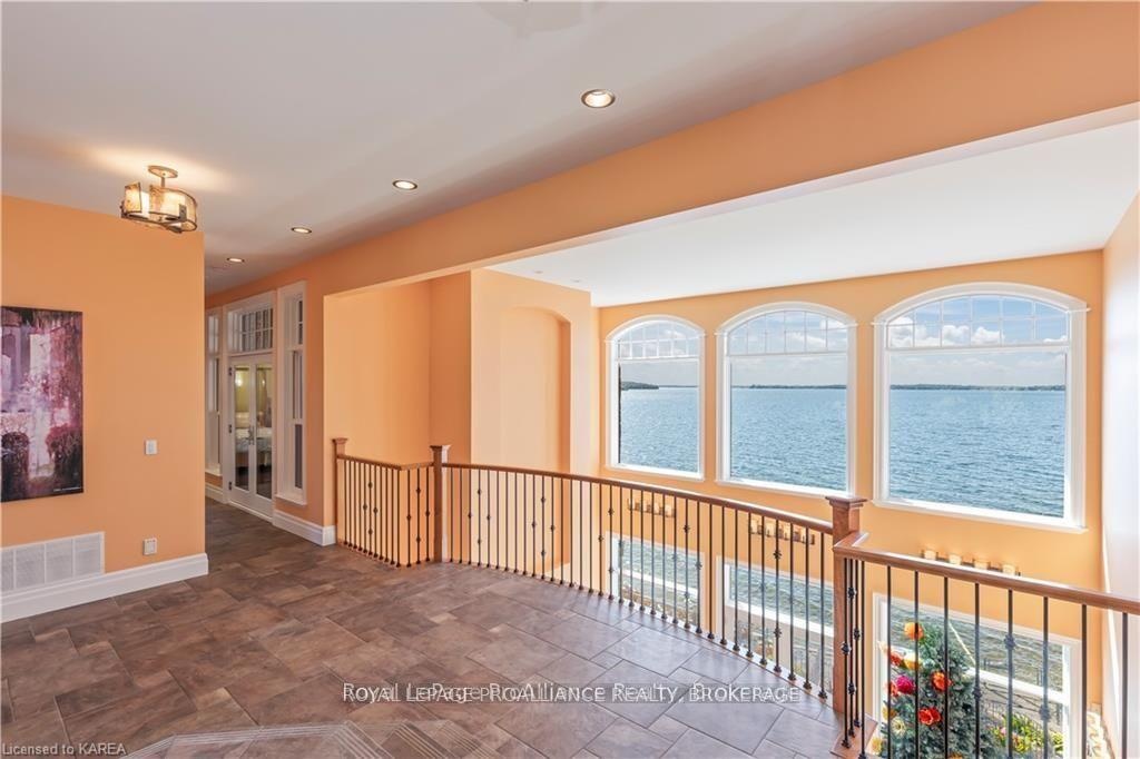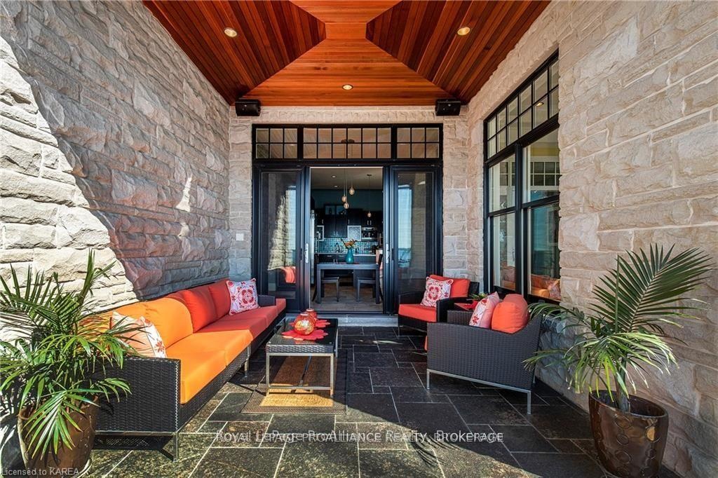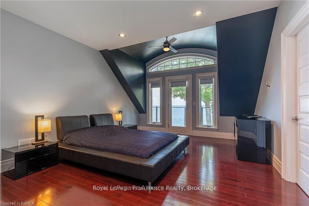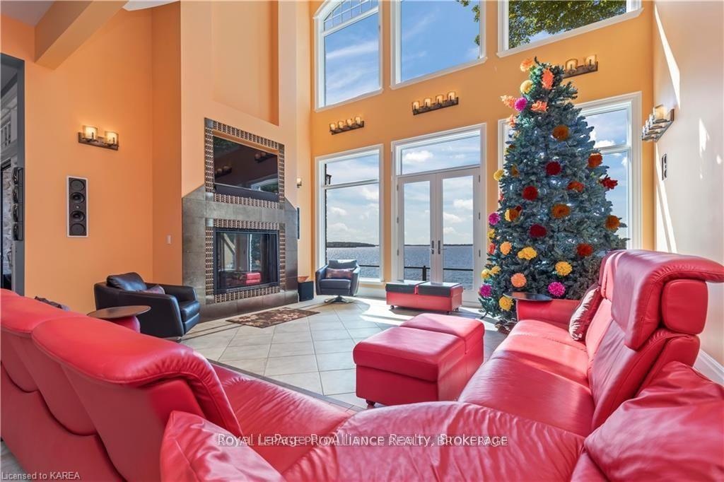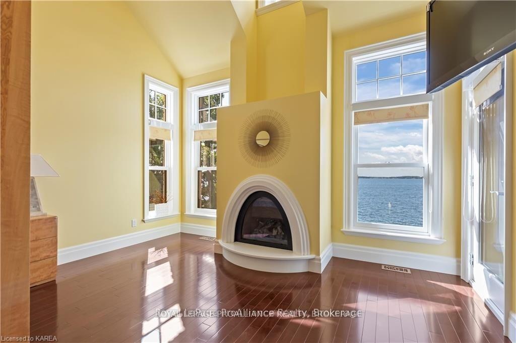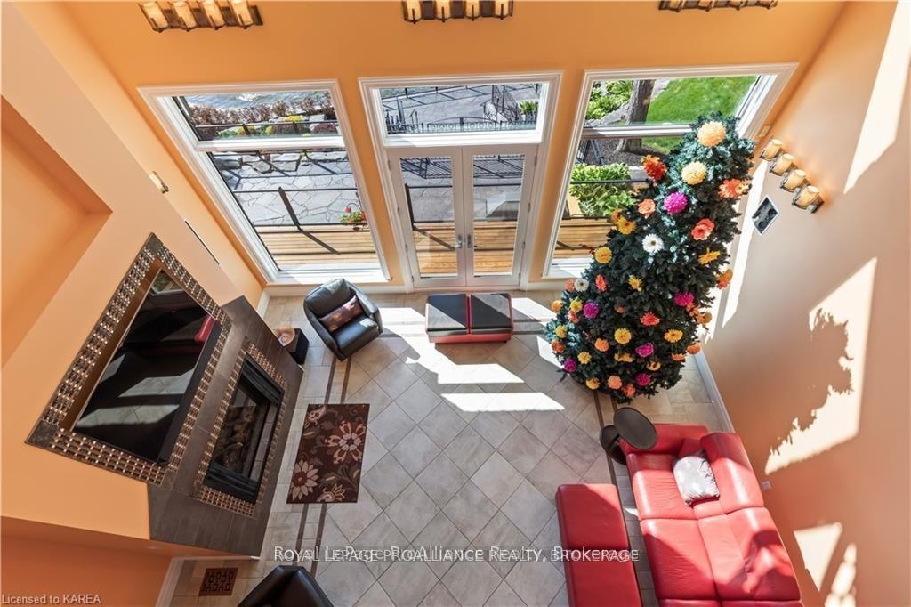A true architectural masterpiece on the St. Lawrence River, this 4+1 bedroom, 5 bath custom-built residence offers over 6,000 sq. ft. of refined living space where every detail reflects timeless design and craftsmanship. Panoramic, south-facing waterfront views fill the home with natural light, while multiple terraces and balconies invite you to enjoy the outdoors year-round. The professionally landscaped grounds are a showpiece - meticulously designed with stone walkways, tiered gardens, mature trees, and accent lighting that create a private, resort-like atmosphere for entertaining or relaxation. Inside, the open concept main level showcases soaring ceilings and a chef's kitchen featuring Viking, Wolf, Miele, and Fisher & Paykel appliances, flowing seamlessly to elegant living and dining areas anchored by three fireplaces (one wood-burning). An elevator offers easy access to all levels, including a luxurious primary suite with breathtaking river views, a private balcony, and a spa-inspired ensuite. The main level features a billiard room. The lower level features a soundproof music room or home theatre, and fitness area. Expansive terraces with power screens capture spectacular sunrises and sunsets over the river. Perfectly located just a short walk to Treasure Island Marina and The Cove restaurant, this extraordinary property blends architectural excellence with stunning and natural beauty - offering the ultimate waterfront lifestyle.