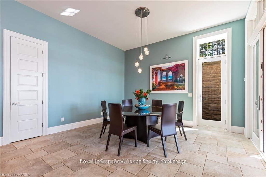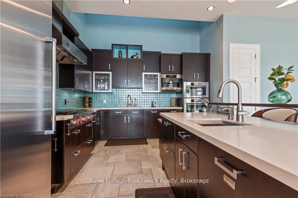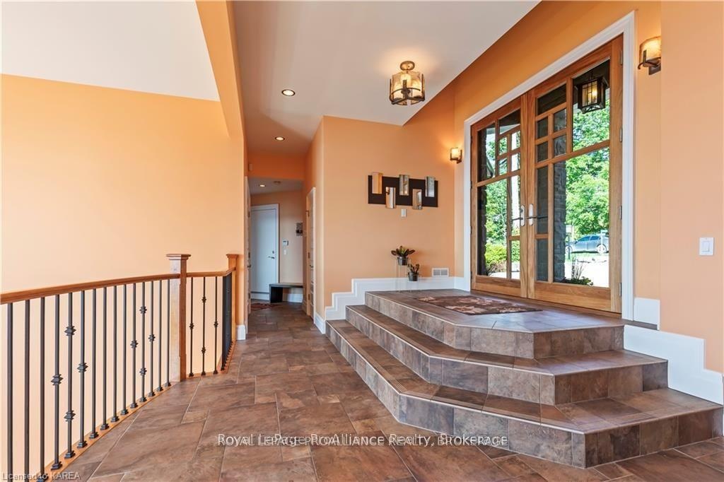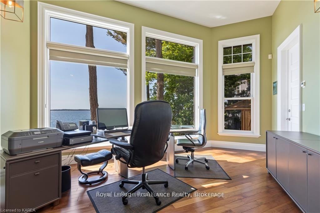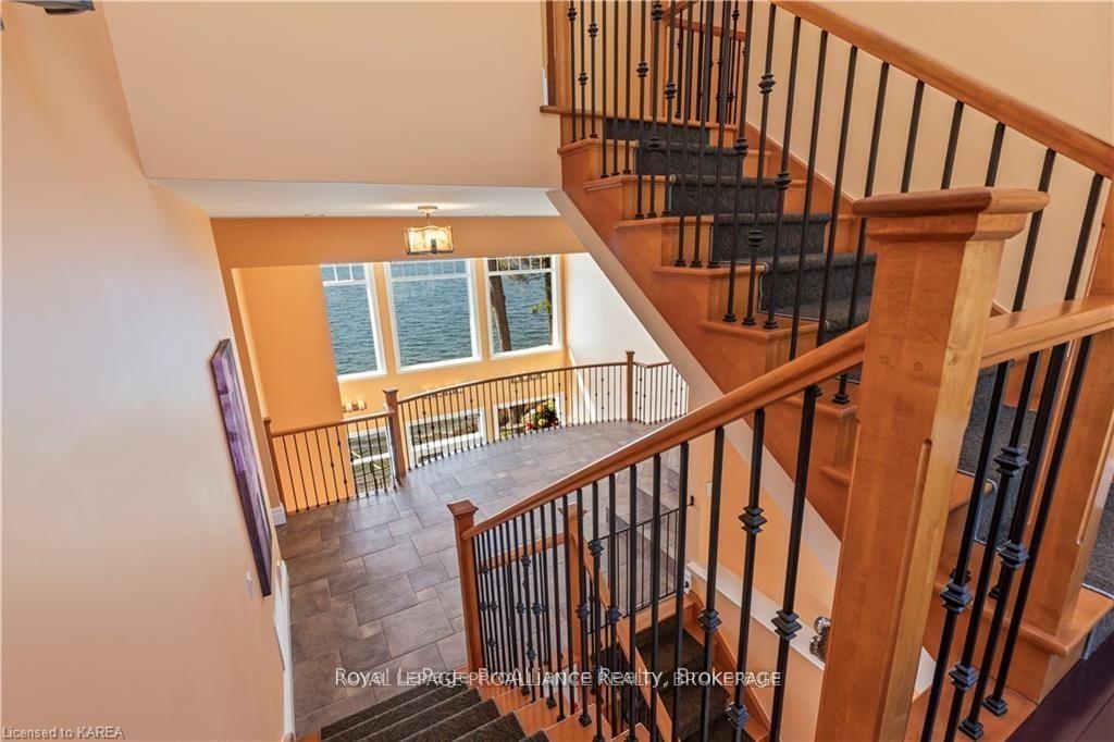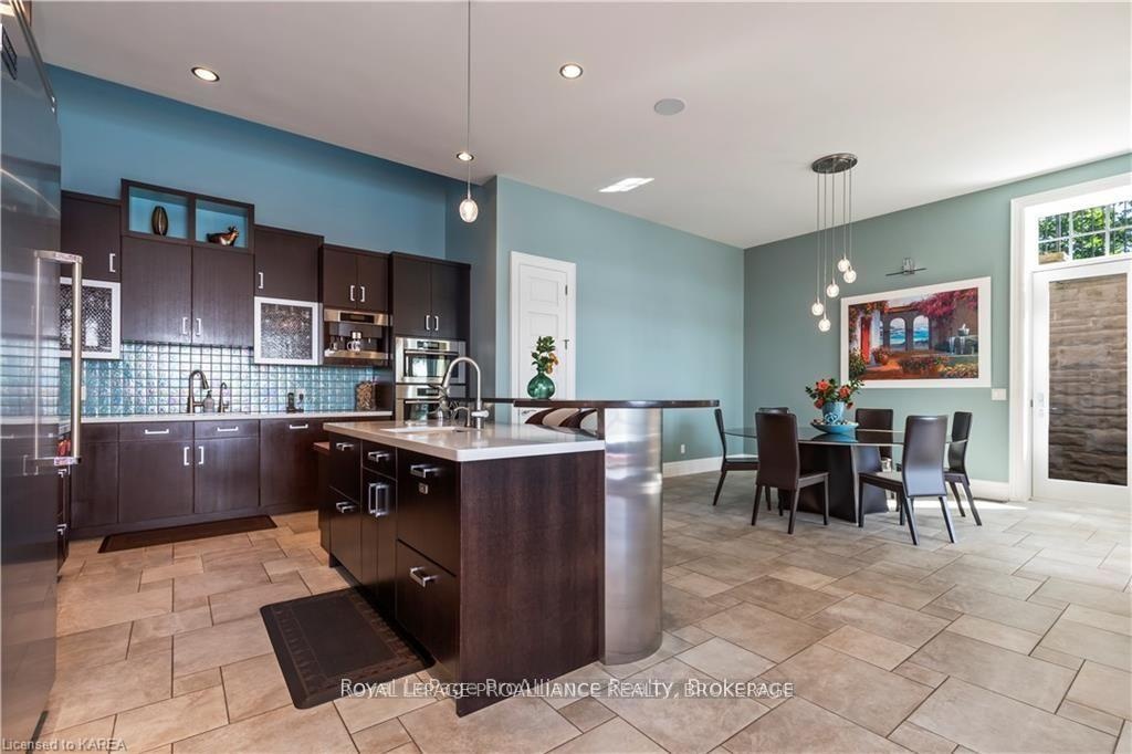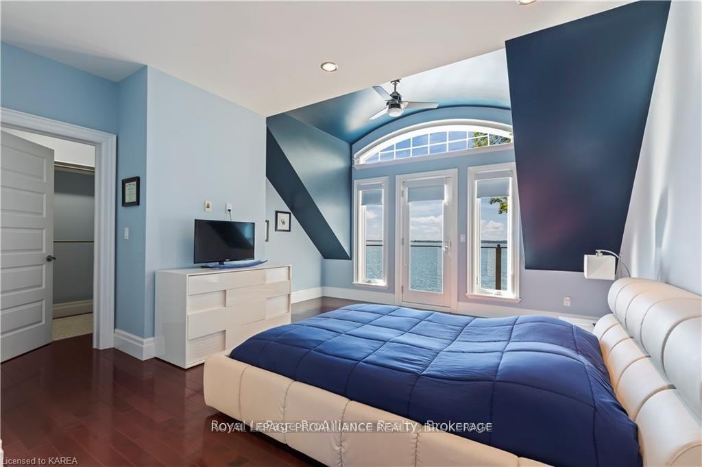 A true architectural masterpiece on the St. Lawrence River, this 4+1 bedroom, 5 bath custom-built residence offers over 6,000 sq. ft. of refined living space where every detail reflects timeless design and craftsmanship. Panoramic, south-facing waterfront views fill the home with natural light, while multiple terraces and balconies invite you to enjoy the outdoors year-round. The professionally landscaped grounds are a showpiece - meticulously designed with stone walkways, tiered gardens, mature trees, and accent lighting that create a private, resort-like atmosphere for entertaining or relaxation. Inside, the open concept main level showcases soaring ceilings and a chef's kitchen featuring Viking, Wolf, Miele, and Fisher & Paykel appliances, flowing seamlessly to elegant living and dining areas anchored by three fireplaces (one wood-burning). An elevator offers easy access to all levels, including a luxurious primary suite with breathtaking river views, a private balcony, and a spa-inspired ensuite. The main level features a billiard room. The lower level features a soundproof music room or home theatre, and fitness area. Expansive terraces with power screens capture spectacular sunrises and sunsets over the river. Perfectly located just a short walk to Treasure Island Marina and The Cove restaurant, this extraordinary property blends architectural excellence with stunning and natural beauty - offering the ultimate waterfront lifestyle.