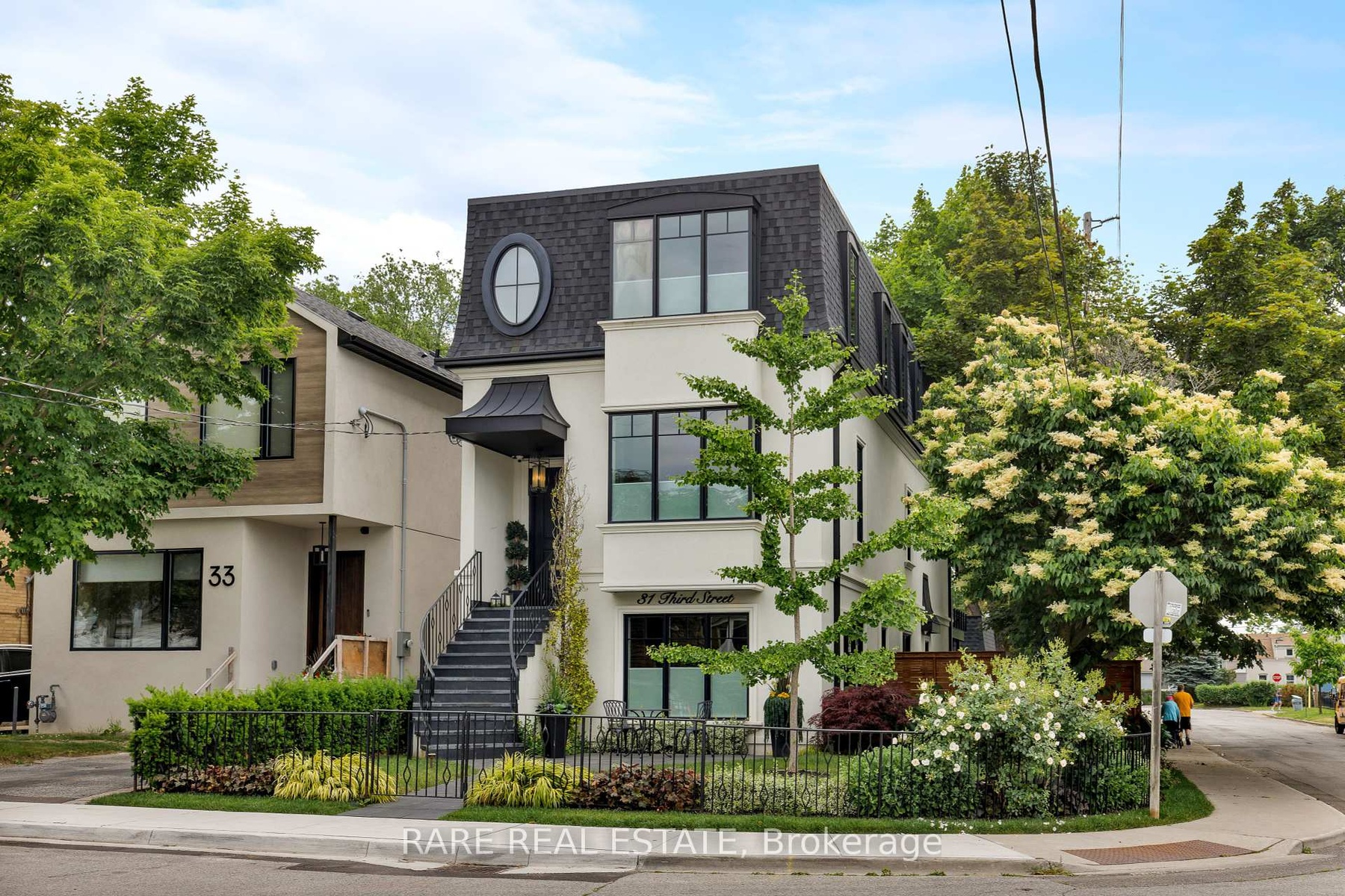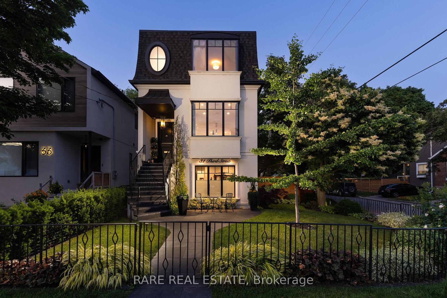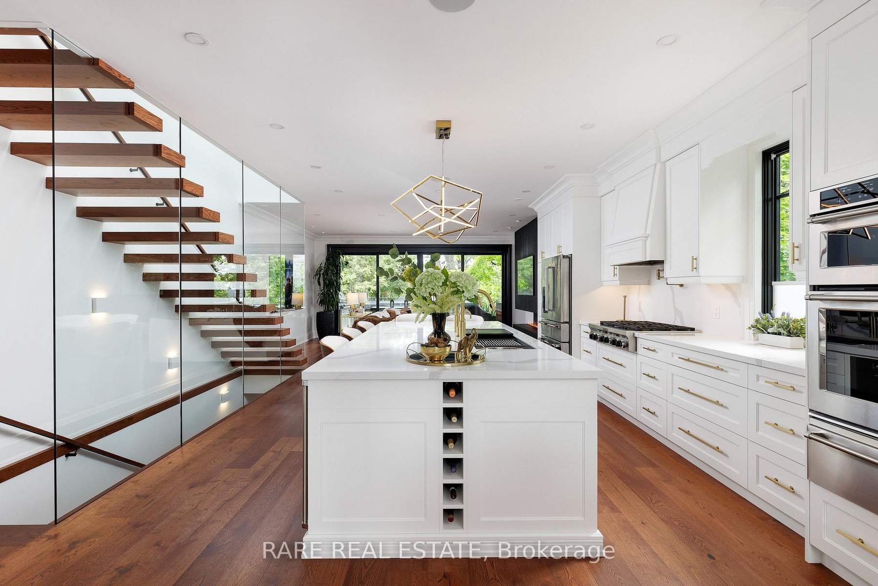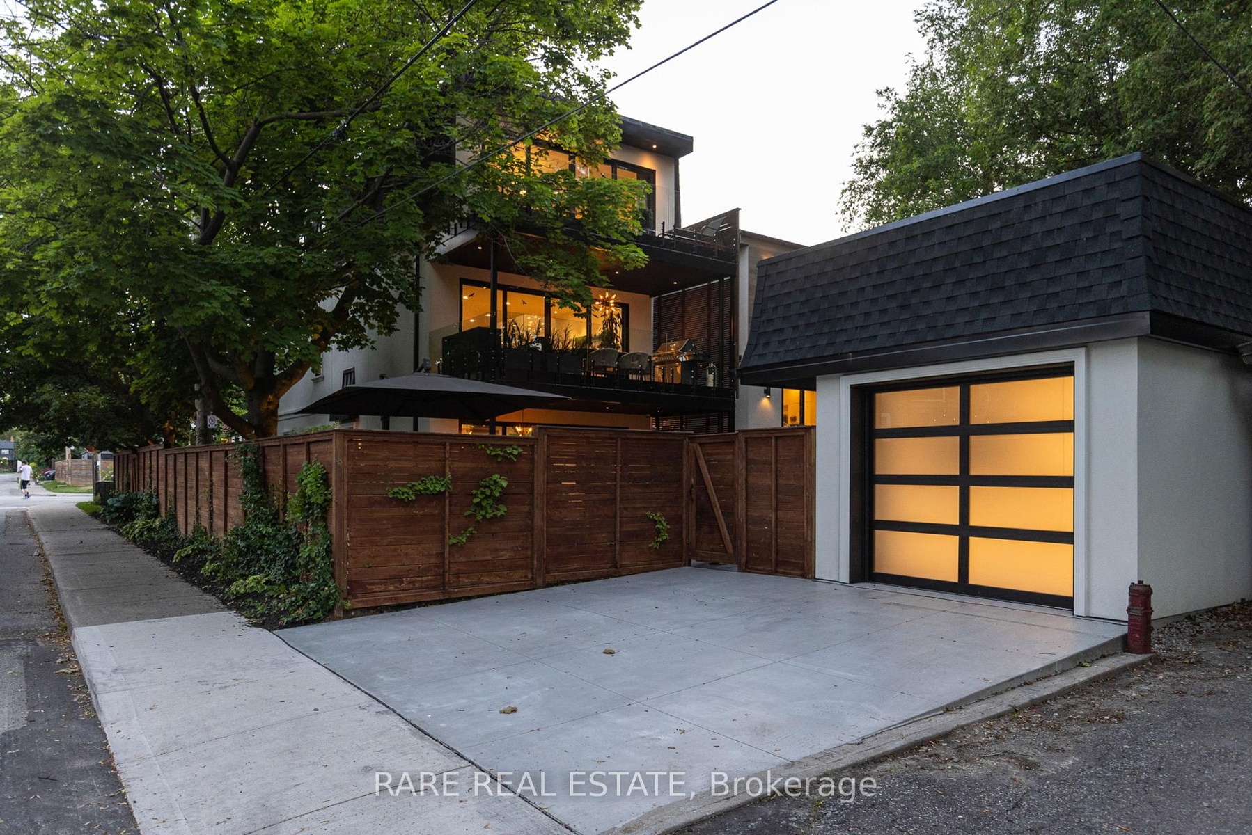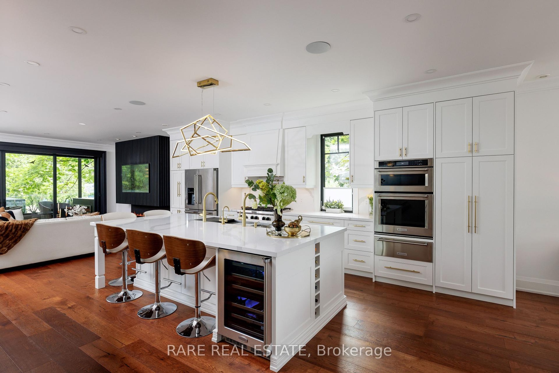 A stunning work of art. A custom home, built with a passion for design and architecture, and attention to every detail. Situated on a majestic corner lot with picturesque landscaping, wide backyard, views of the water and steps to the waterfront parks and Lake Shore shops. Fully custom home with 3,672 sqft above grade space, no basement, 9 foot ceilings on all levels and 5 above grade bedrooms. A home where luxury and warmth come together. Every inch of this home has been masterfully curated with the finest quality finishes and technologies, creating a space that is both breathtaking and inviting. Fully open main level with floating wood and glass staircase that fills the room with sunlight. Designer kitchen with a massive 10 ft kitchen island, and 5 foot Galley Kitchen workstation sink with triple faucets. Double door walk out to the covered terrace overlooking the backyard gardens. Luxurious and relaxing primary suite with views of the sunrise over the water and a walk out to the terrace set within the treetops. Complete with his walk-in closet and her walk-in dressing room with custom wall to wall cabinets and makeup vanity. The backyard's professionally designed landscaping envelops the home in natural beauty and privacy, a cottage setting in the city. The garage completes the outdoor entertaining with a cabana bar glass garage door and rough in mini kitchen. Rough-in kitchen on lower level for in-law suite. An abundance of features and technology for comfortable everyday living and elevated entertaining. Hi-Velocity heat/cool air system with 4 thermostat control zones (1st floor, 2nd floor, 3rd floor, Principal suite). 6 zone in-floor radiant heating on ground level and full bathrooms. Voice & phone controlled smart home integration with custom Lutron lighting control system and Sonos sound system. 3 Samsung 65 inch Frame TVs integrated into the fireplace walls with Sonos play bars. See full feature list. Dressing room can be converted back to the 5th bedroom.