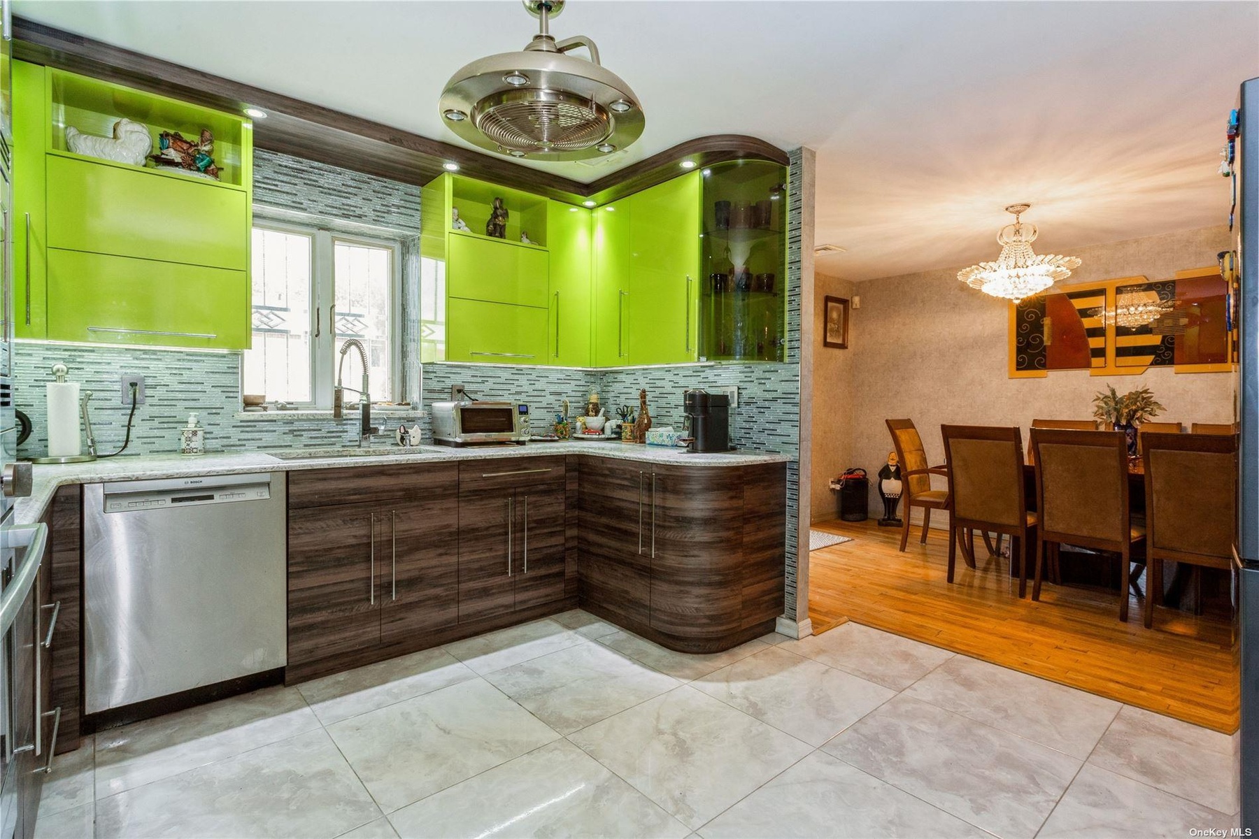 - Kitchen with dishwasher, a chandelier, backsplash, pendant lighting, and light stone counters