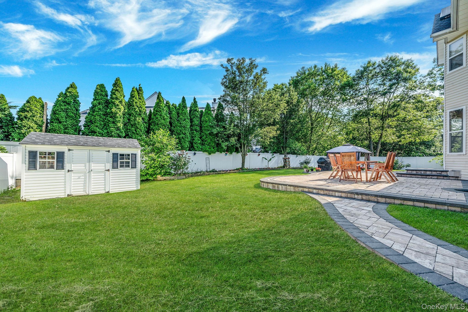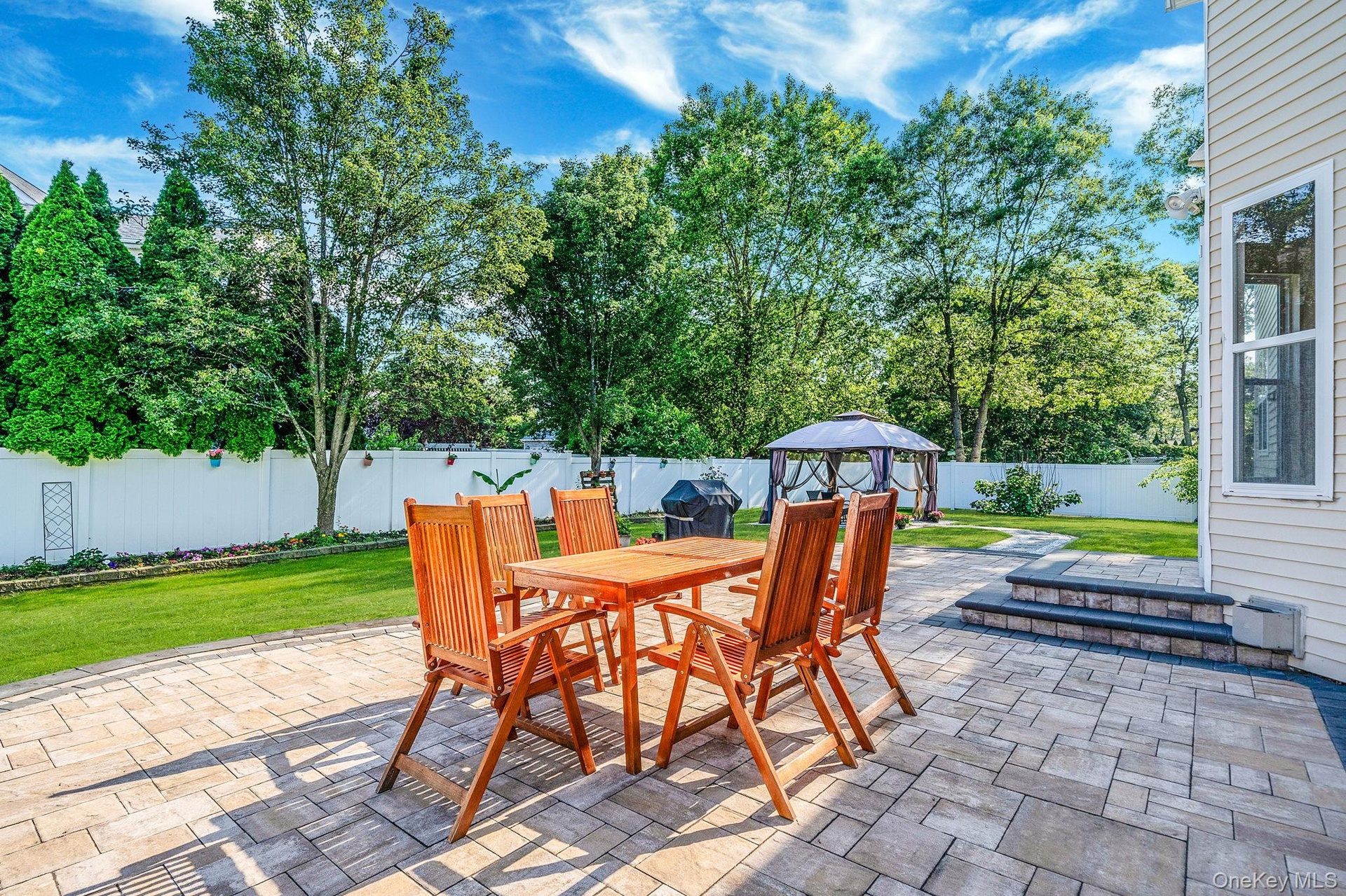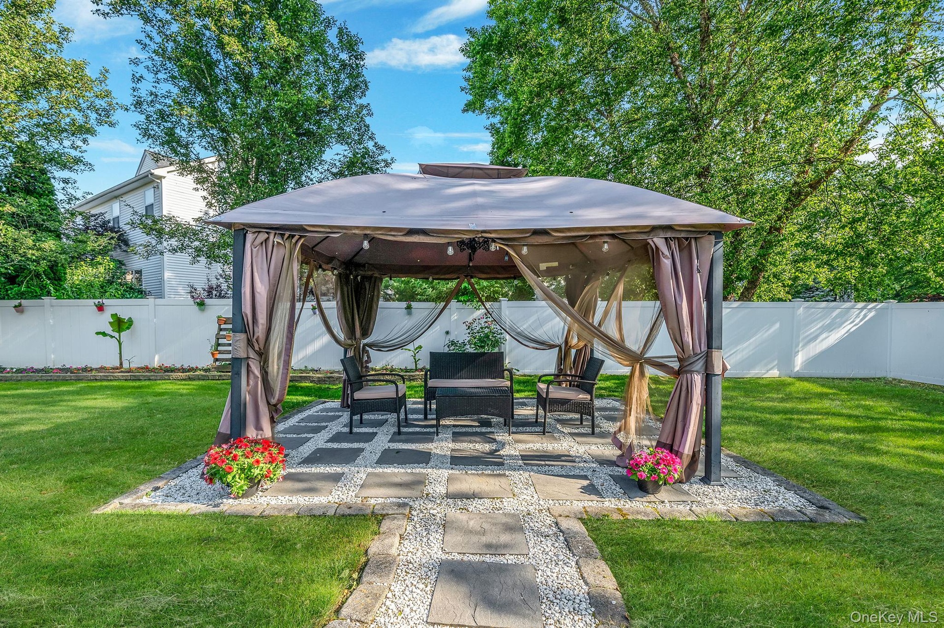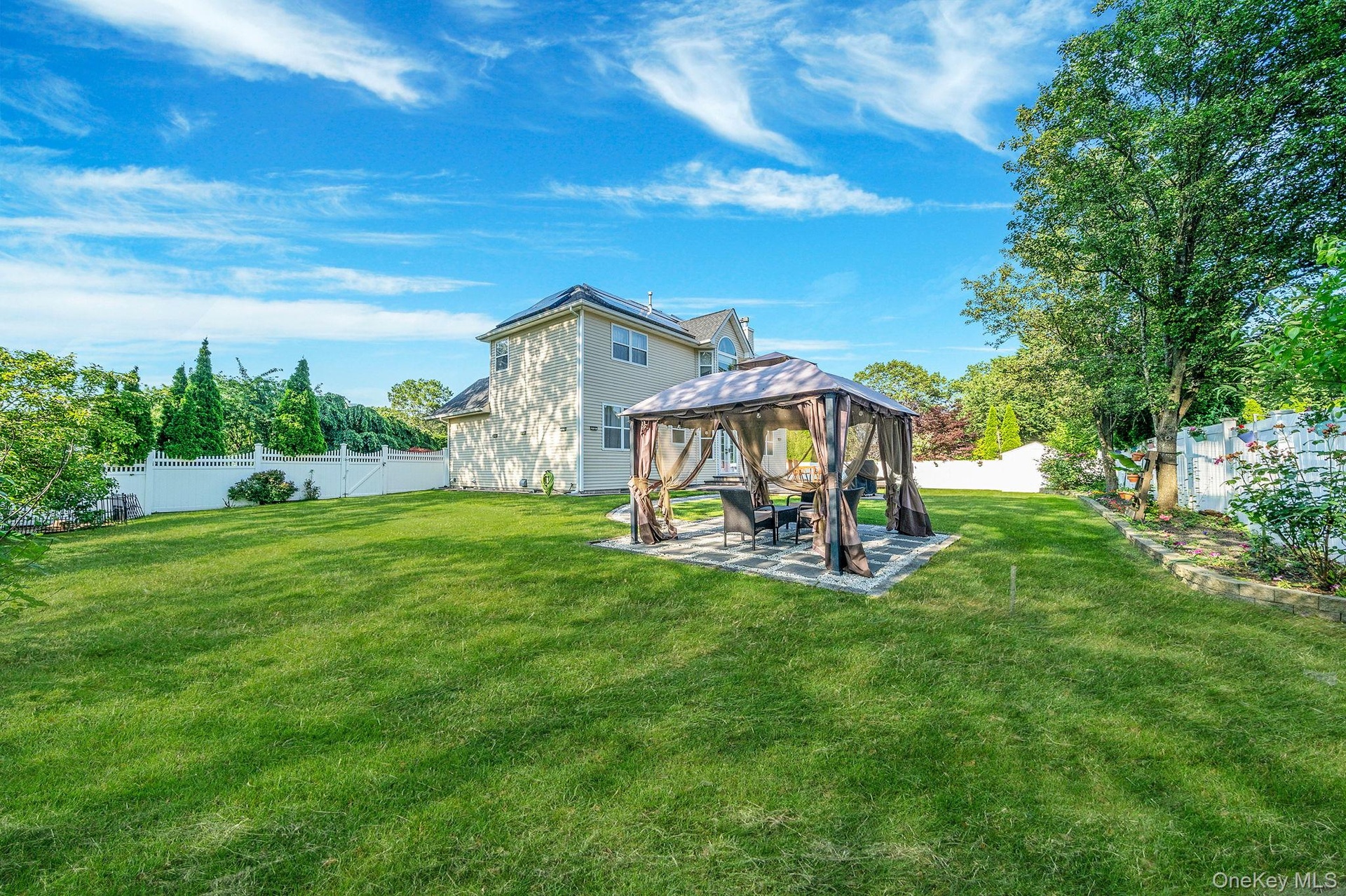 - Fenced backyard featuring a gazebo and a patio area