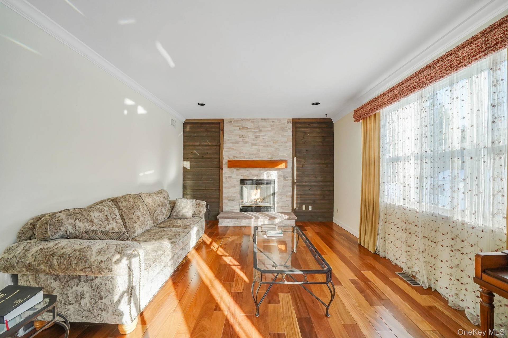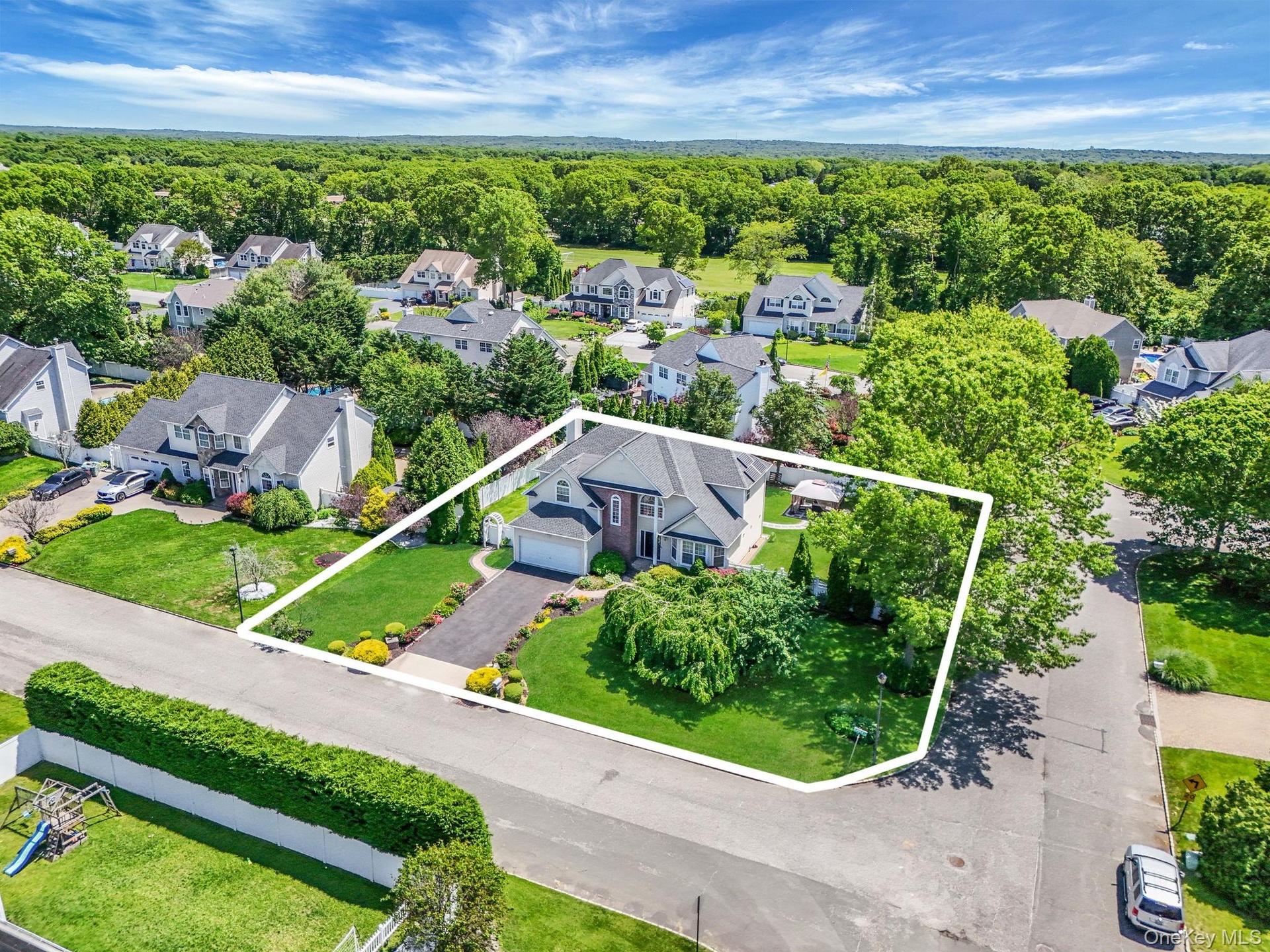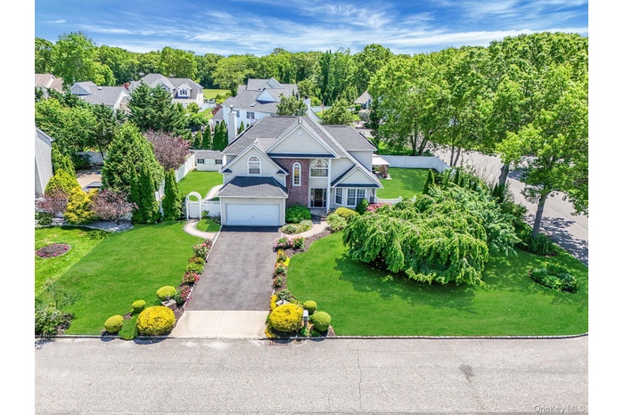 Welcome to 18 Cayla Lane! A beautifully maintained 5-bedroom, 2.5-bath Post Modern perfectly positioned on a corner lot. This home offers a grand entrance with soaring ceilings, an open-concept layout, gleaming hardwood floors, and a cozy wood-burning fireplace in the family room featuring teak wood. The spacious living and entertaining areas flow seamlessly, ideal for modern living. One of the five bedrooms is conveniently located on the main floor—perfect for a home office, guest room, or flex space to suit your needs. The spacious primary offers two walk-in closets and a full en suite. Major updates include a NEW ROOF and PAID OFF OWNED SOLAR PANELS (2019), two-zone heating and cooling systems (2021), repaved driveway (2024), and Cambridge paver patio, walkway, and stoop (2021). Additional highlights include 200 AMP electricity, a 6-zone sprinkler system, white PVC fencing, professional landscaping, crown molding, fresh interior paint (2024), a renovated powder room (2024), and a low-line sewer system. Not to forget the full basement full of surprises—this is the one you’ve been waiting for!