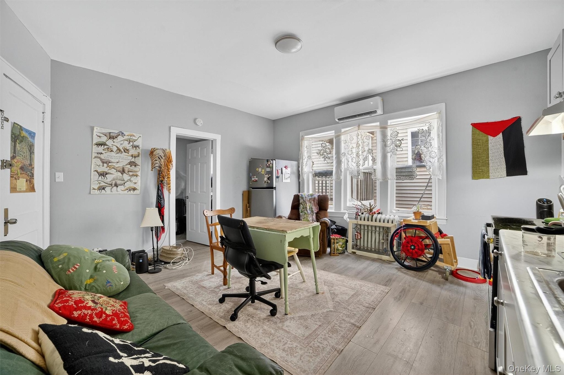 - Game room featuring a wall unit AC, wood finished floors, and radiator heating unit