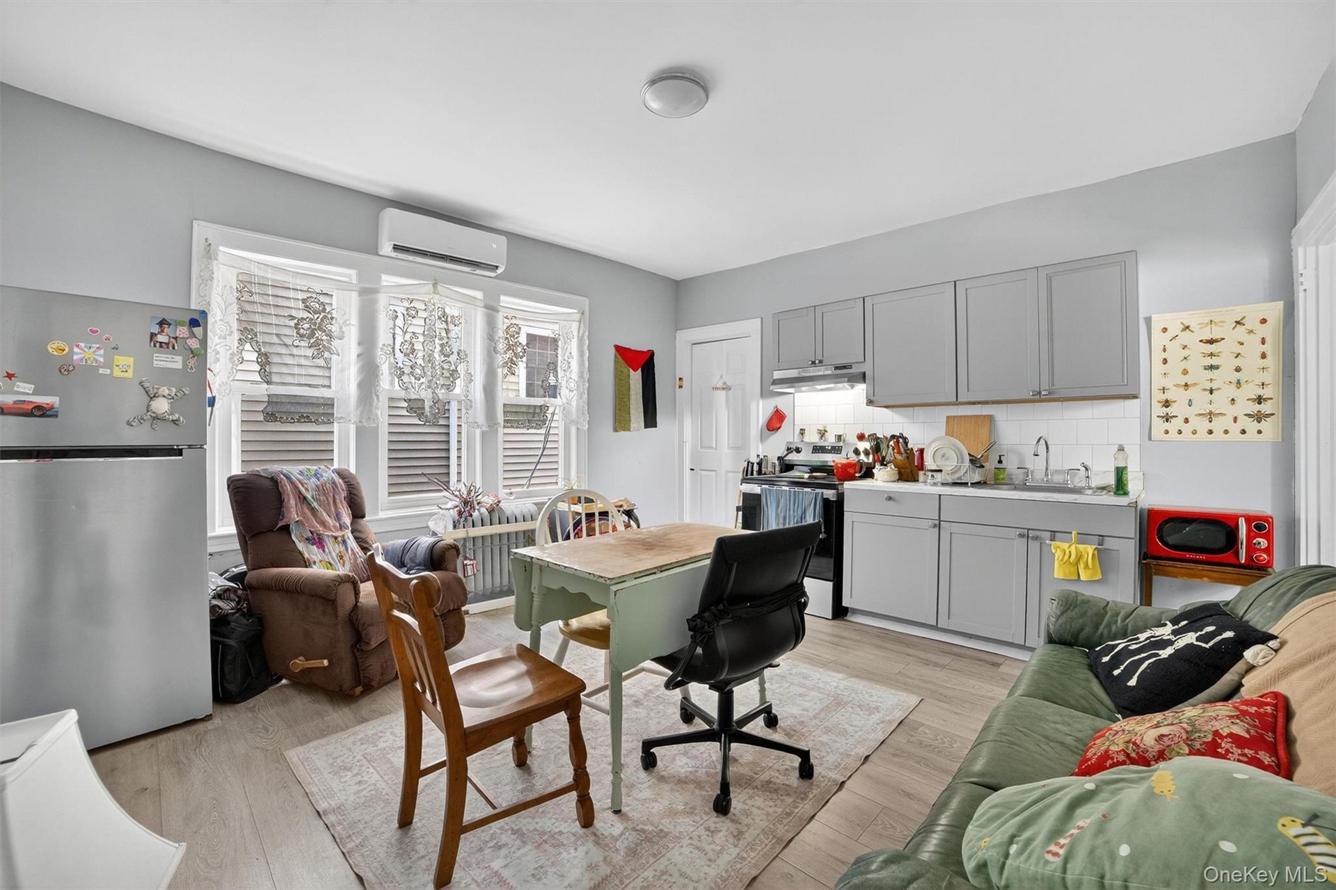 - Rec room with a wall unit AC, light wood finished floors, and radiator heating unit