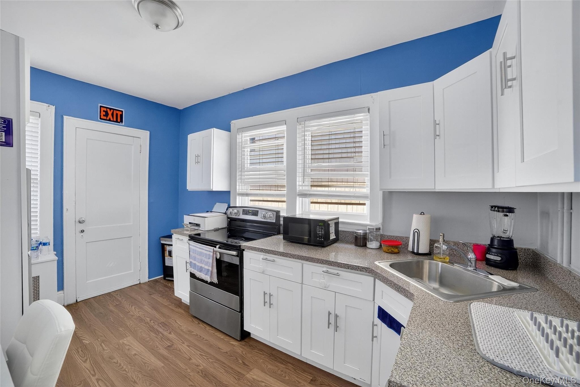 - Kitchen featuring stainless steel electric stove, black microwave, white cabinets, light wood-type flooring, and light countertops