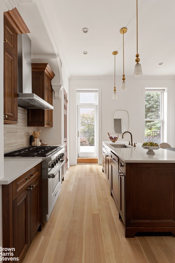 From the moment you step inside, the home's original stone mantels, ornate plasterwork ceilings, pocket doors, and a prominent central staircase speak to its storied past. Yet every space has been reimagined for modern living. The parlor-level chef's kitchen blends historic charm with high-performance design, featuring custom cabinetry, Caesarstone Quartz countertops, period-inspired pendant lighting, and a top-tier appliance suite including a Wolf range and hood, Sub-Zero refrigerator, and Miele dishwasher. Bronze fixtures and gleaming hardwood floors round out this inviting space, ideal for both everyday living and entertaining.