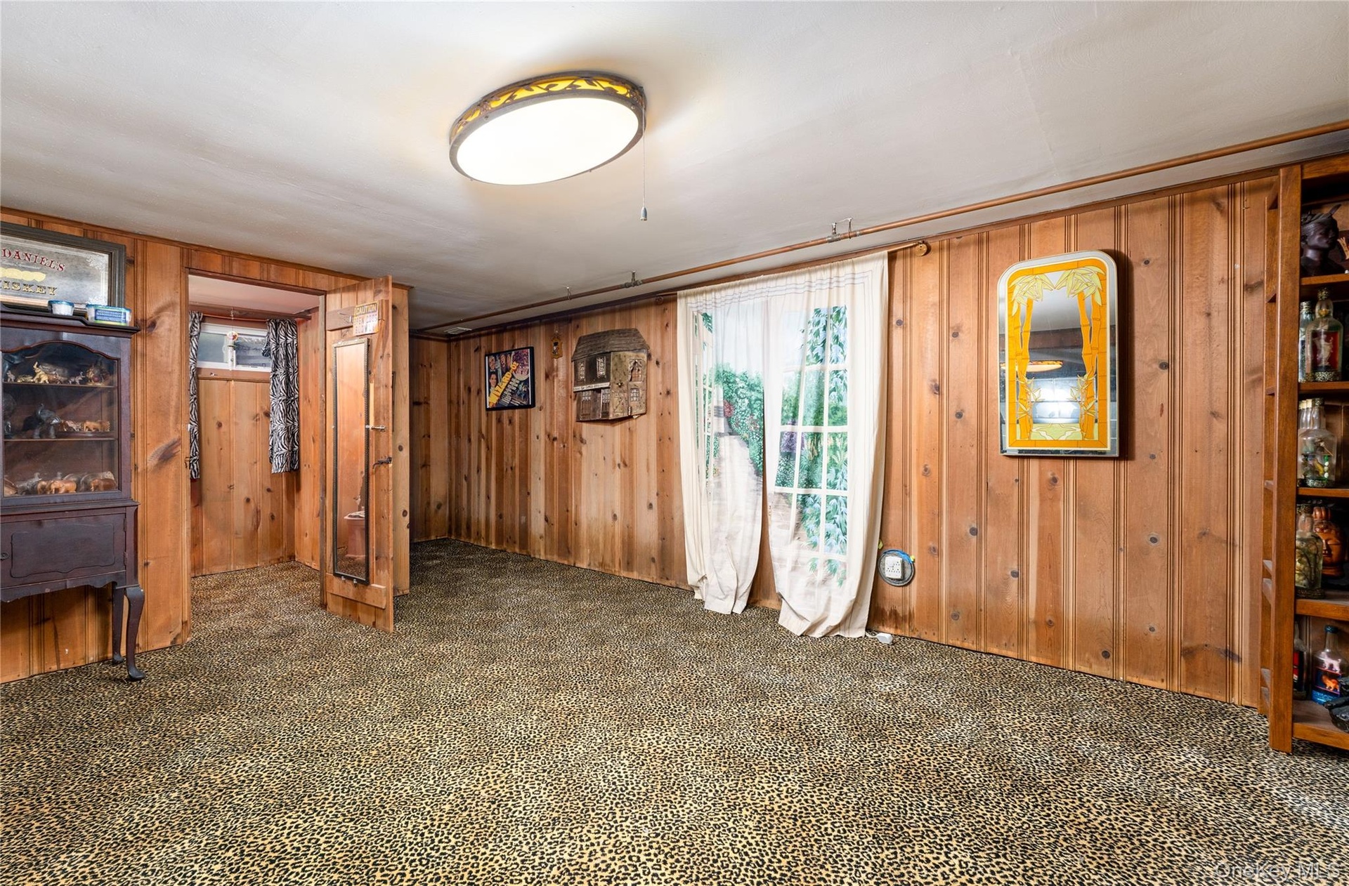 - Carpeted bedroom with ornamental molding, a fireplace, ceiling fan, and wood walls
