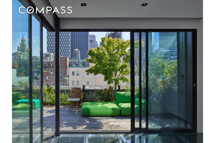 DescriptionThis spectacular and meticulously renovated Tribeca penthouse loft is a rare find, with open city views from every room, abundant light through huge windows, and a fabulous private roof terrace. Expertly blending clean, modern finishes with the original elements of an historic building, this luxurious home is a perfect oasis of calm in an ideal downtown location at the corner of Franklin Street. A very recent renovation added significant volume to the space, rebuilding the rooftop addition as a glass cube that floods the living area below with light, and creating over 14’ ceilings above the central stair and entry hall.