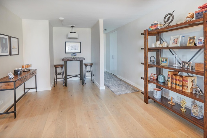 The welcoming entrance foyer, with large coat closet, leads into the living room with overhead lighting and amazing views and abundant sunshine. The separate dining area has plenty of space for dinner parties and could be converted into a home office or nursery.