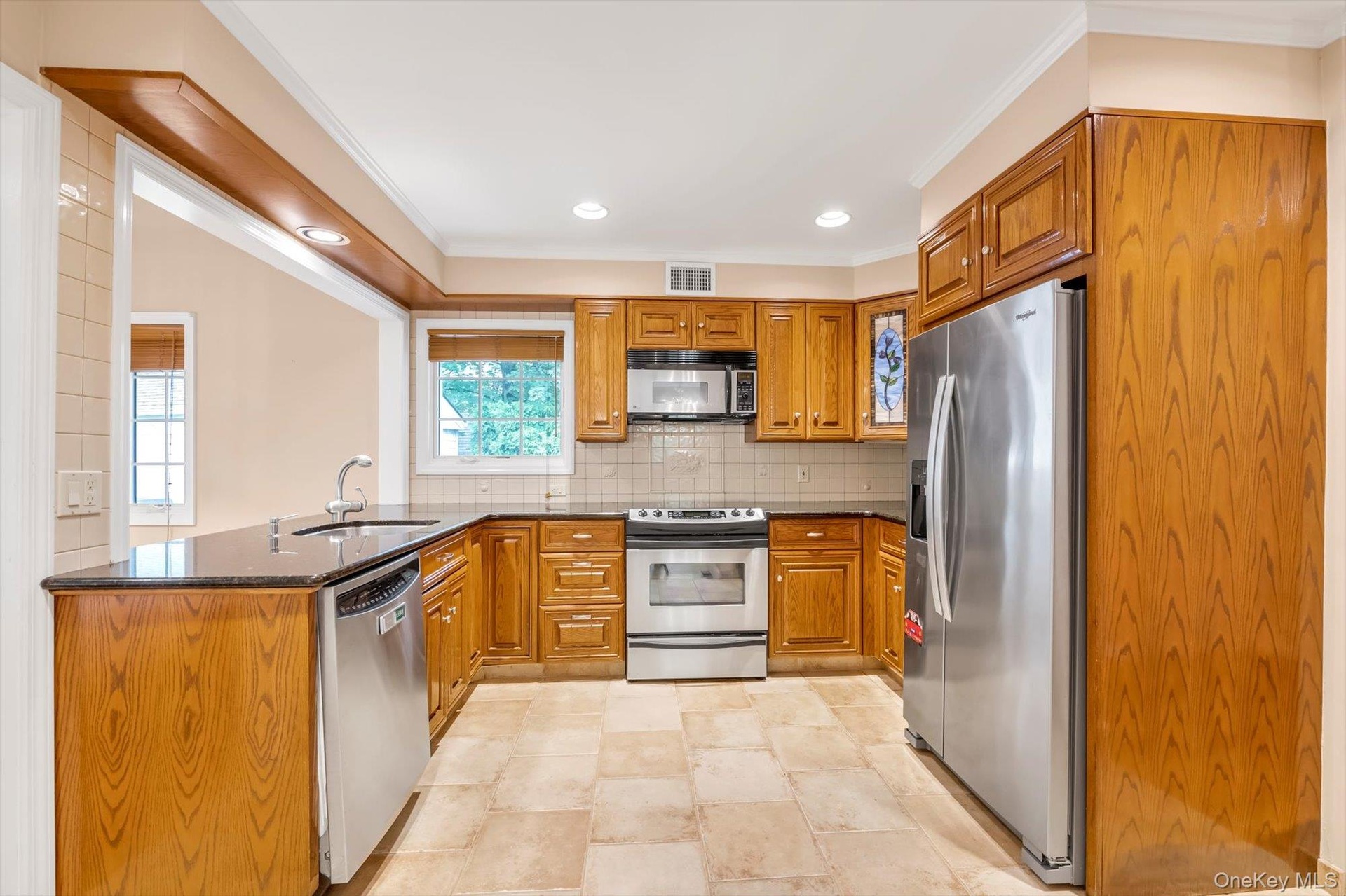 - Kitchen featuring dark stone counters, brown cabinets, appliances with stainless steel finishes, decorative backsplash, and crown molding