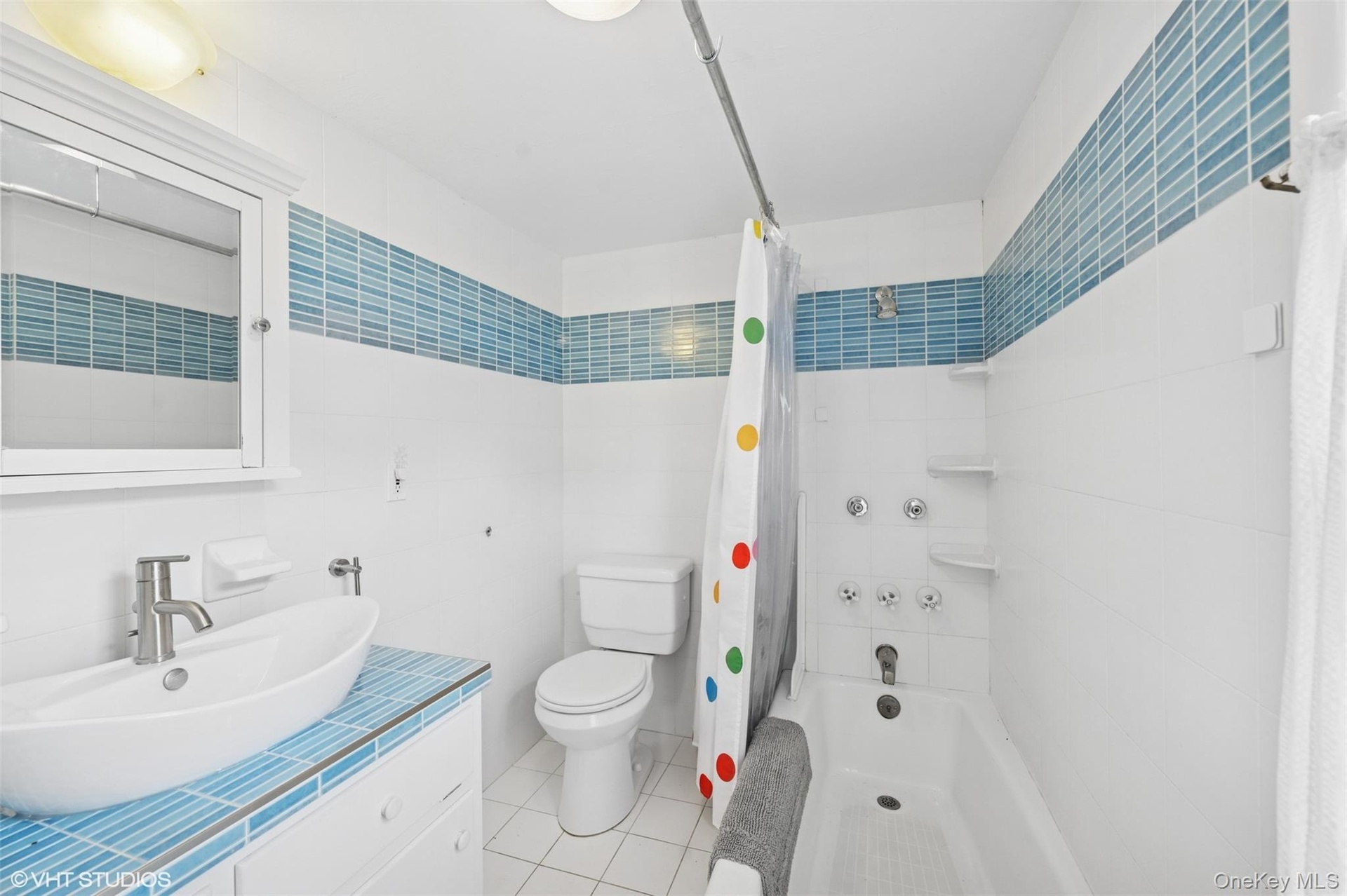 - Full bathroom featuring tile walls, shower / bath combo with shower curtain, tile patterned flooring, and vanity