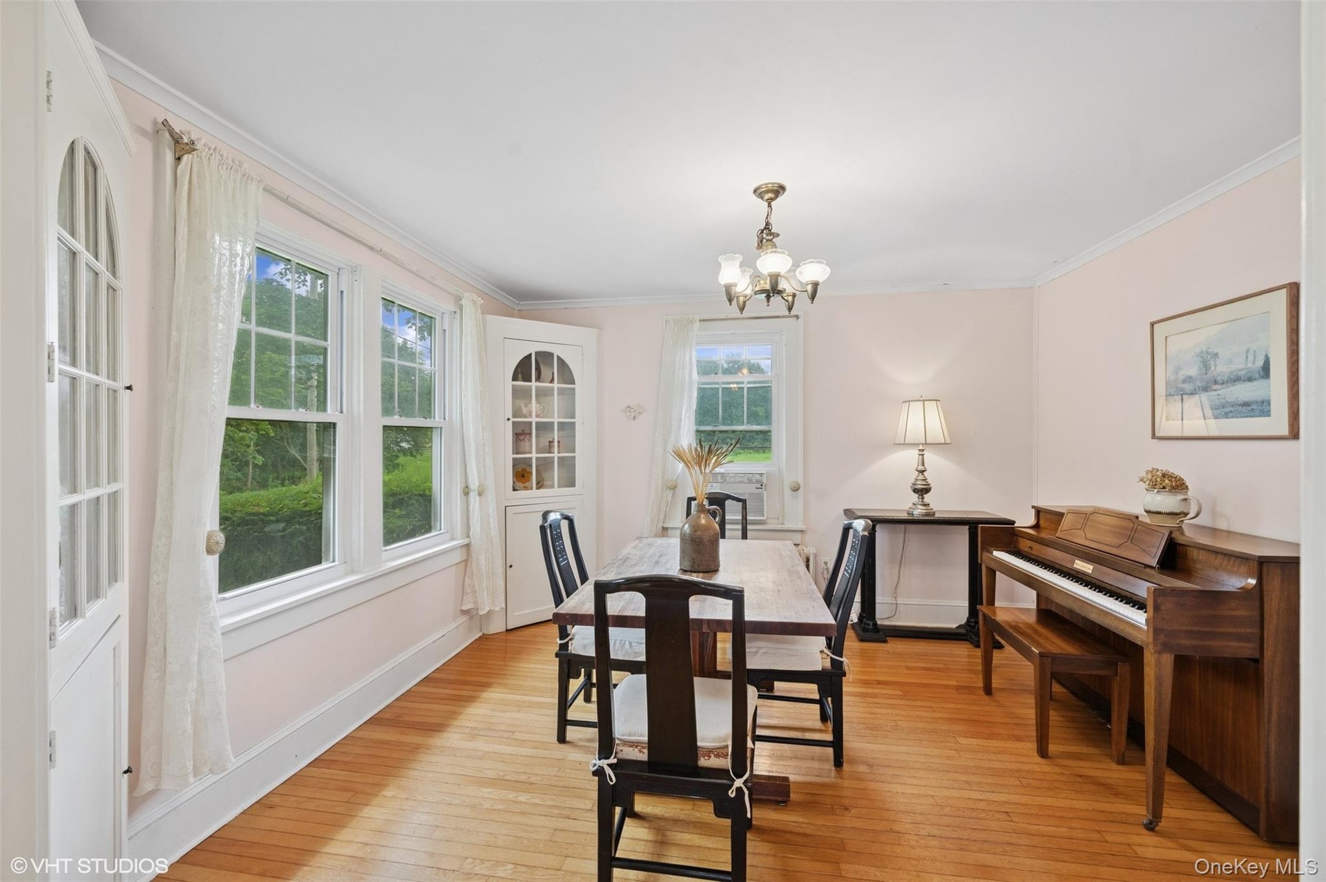- Dining room with a chandelier, ornamental molding, plenty of natural light, and light wood finished floors