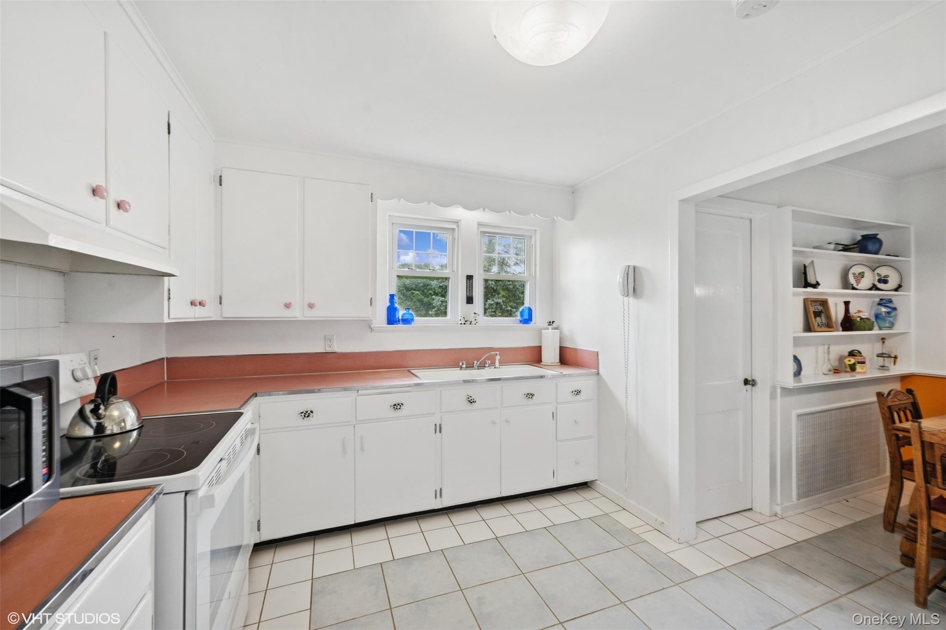 - Kitchen featuring white electric range, stainless steel microwave, white cabinetry, light tile patterned flooring, and crown molding