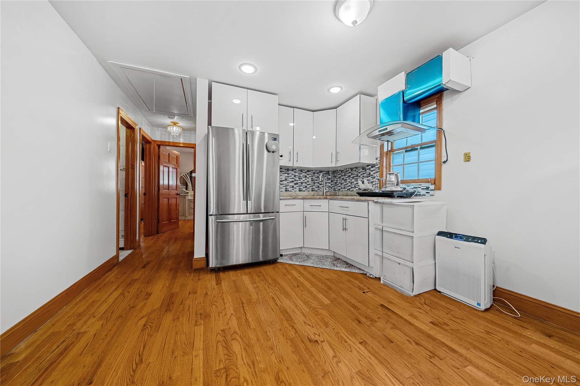 - Kitchen featuring freestanding refrigerator, light wood finished floors, white cabinets, backsplash, and recessed lighting