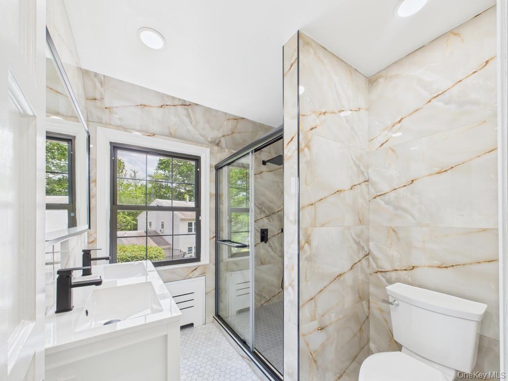 - Bathroom featuring tile walls, vanity, a marble finish shower, and recessed lighting