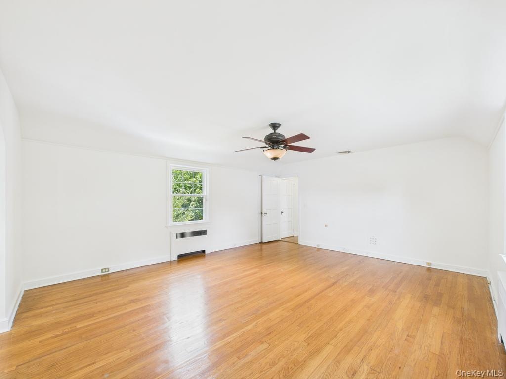 - Empty room with radiator, a ceiling fan, and light wood-style floors
