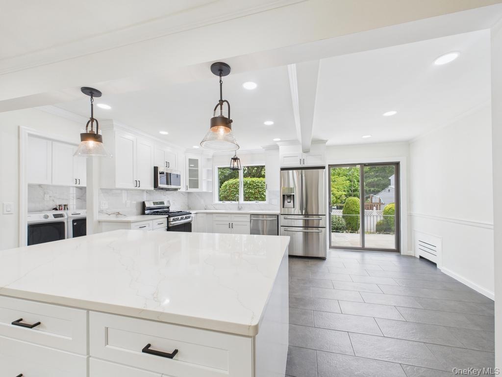 - Kitchen with appliances with stainless steel finishes, washing machine and dryer, tasteful backsplash, healthy amount of natural light, and recessed l