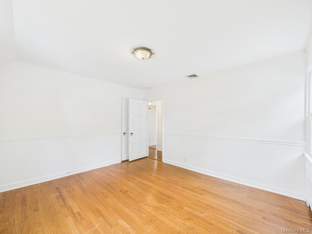 - Unfurnished room with light wood-style flooring and a wainscoted wall