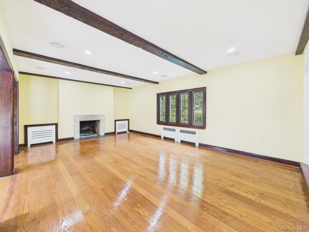 - Unfurnished living room with beam ceiling, wood finished floors, a fireplace with flush hearth, and recessed lighting