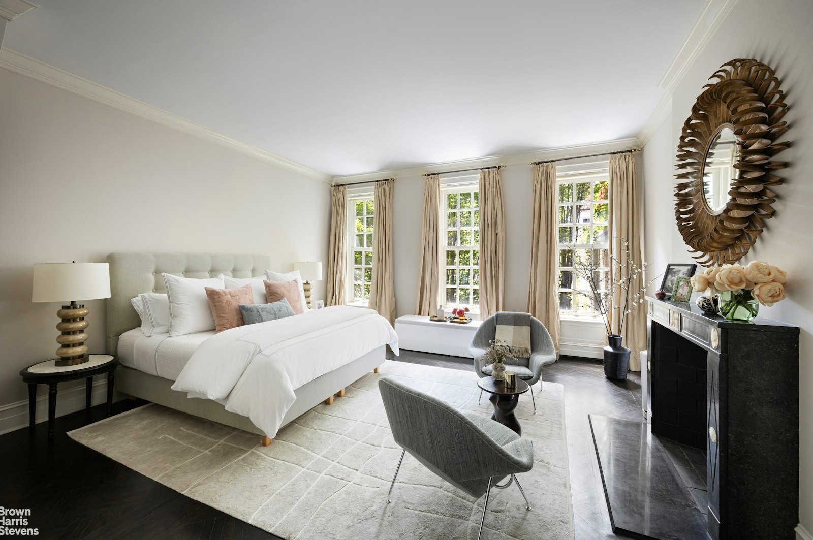 The primary bedroom is a sanctuary of natural light, featuring three large south-facing windows and a striking 19th-century working fireplace. The luxurious en-suite includes a spacious dressing room with custom built-ins, leading to a marble-appointed bathroom with double vanities, soaking tub, and oversized dual-head shower. A versatile north-facing room, currently utilized as an office, completes this private floor.