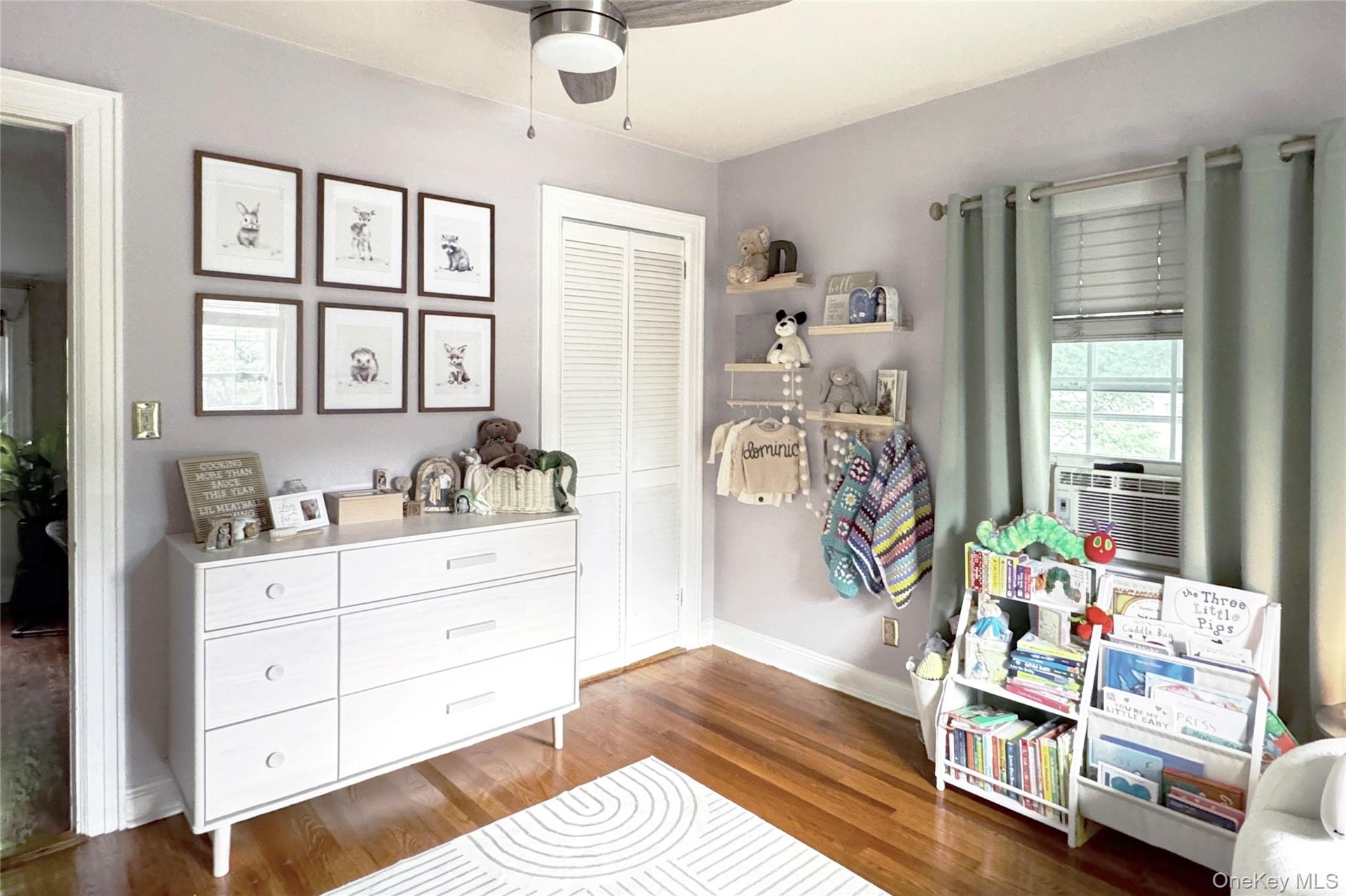 - Bedroom with multiple windows, lofted ceiling, a nursery area, wood finished floors, and a ceiling fan