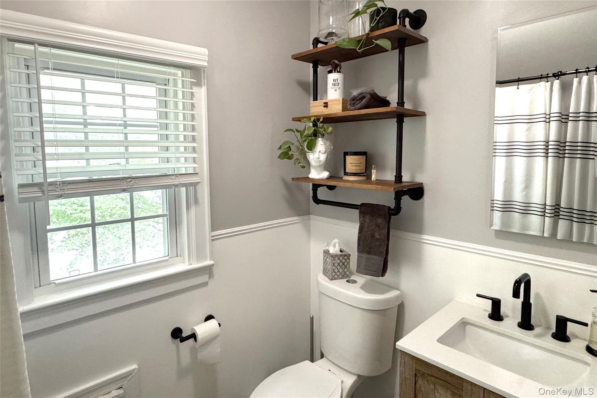 - Full bath featuring vanity and wainscoting