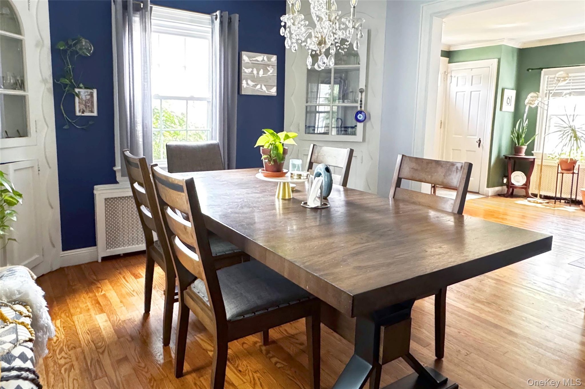 - Living area with radiator, a chandelier, and wood finished floors