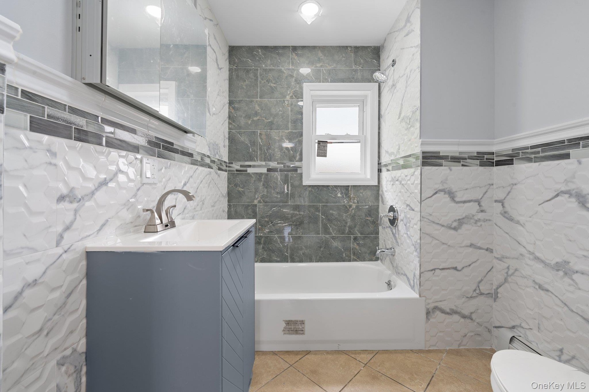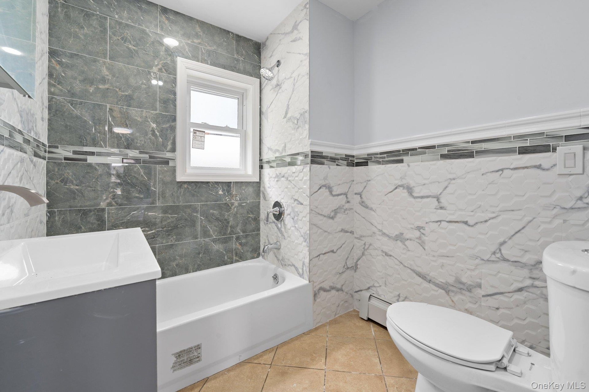 - Bathroom with tile walls, vanity, a baseboard heating unit, shower / bath combination, and recessed lighting