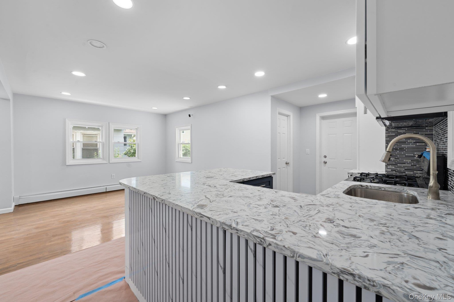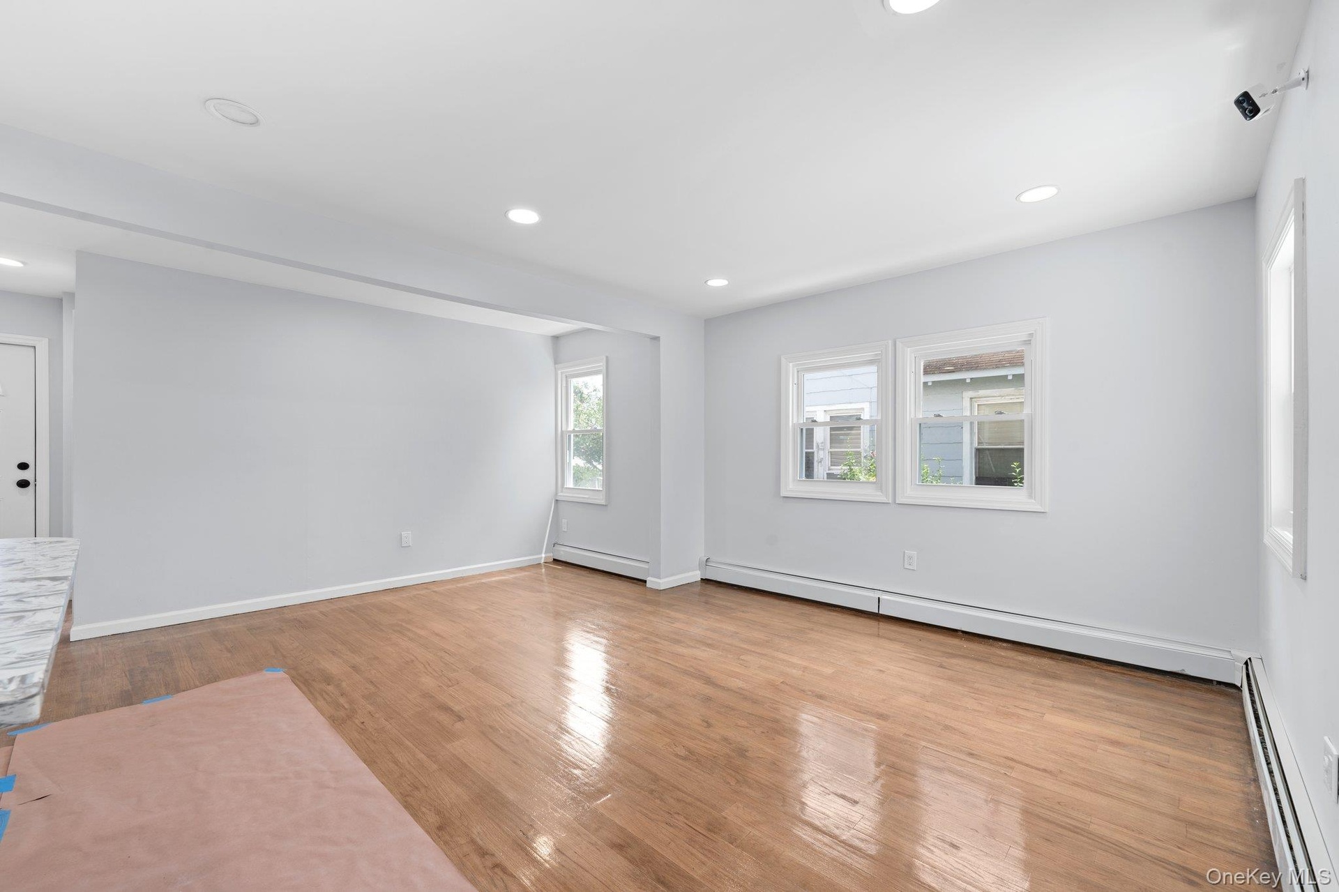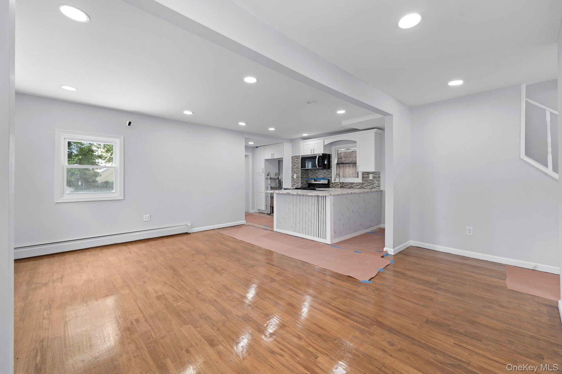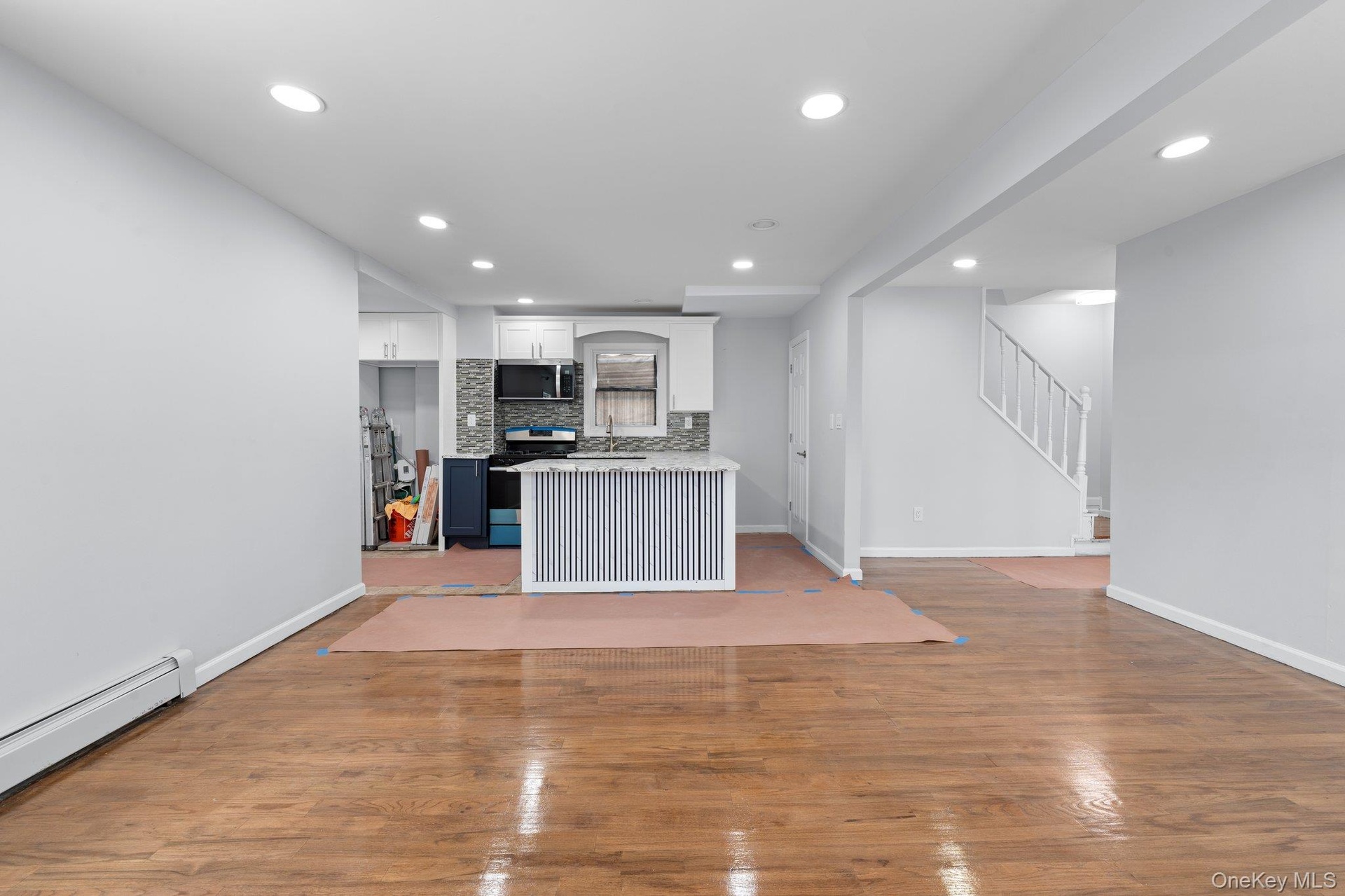 - Unfurnished living room featuring recessed lighting, a baseboard heating unit, and stairs