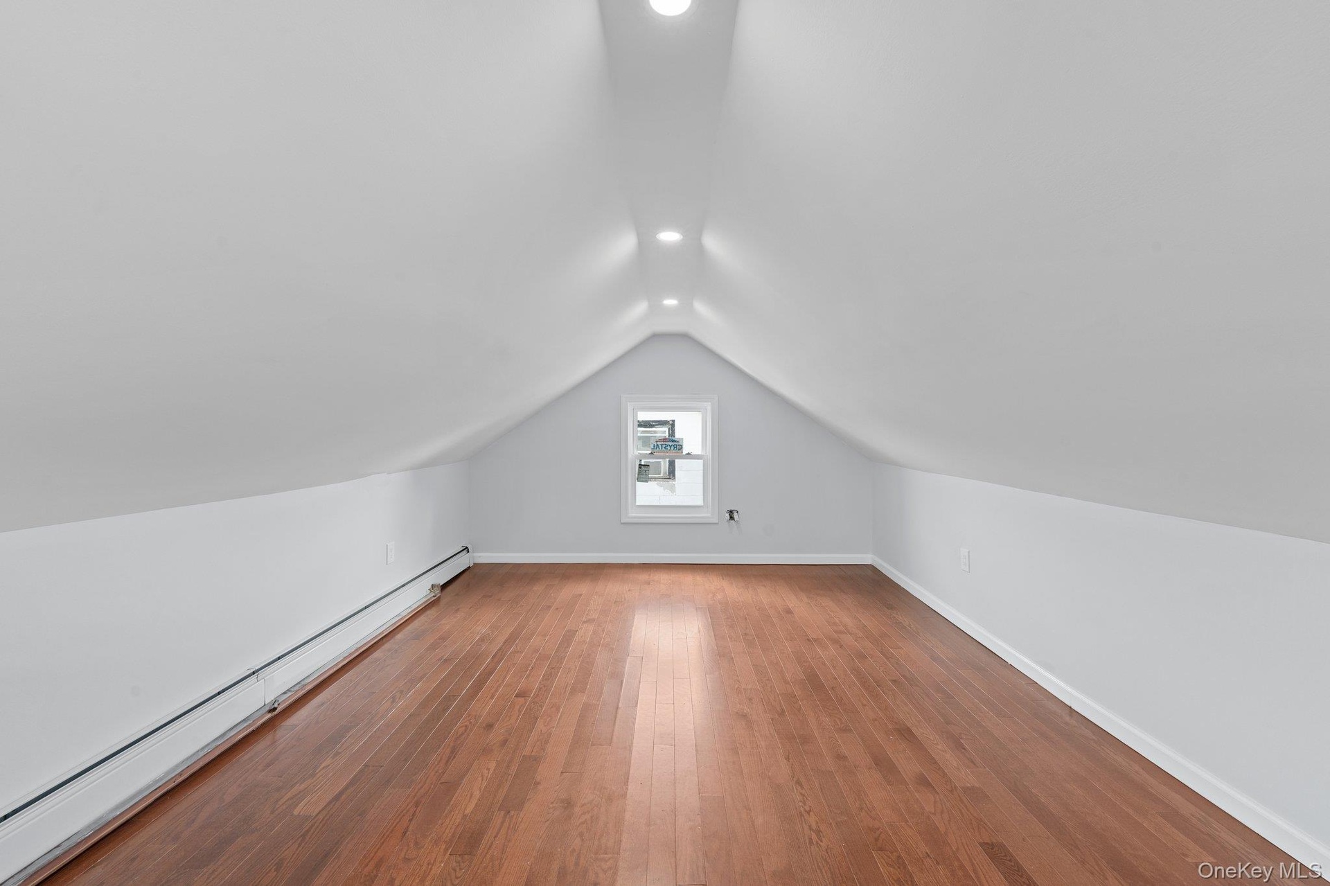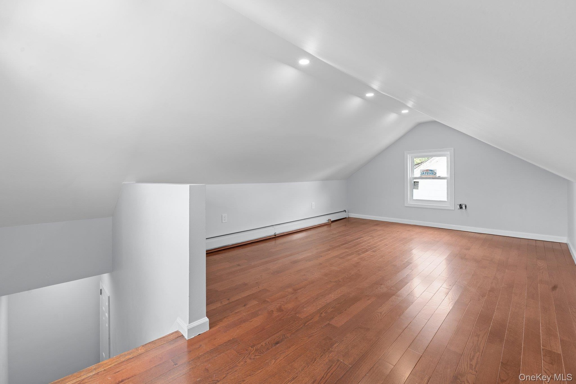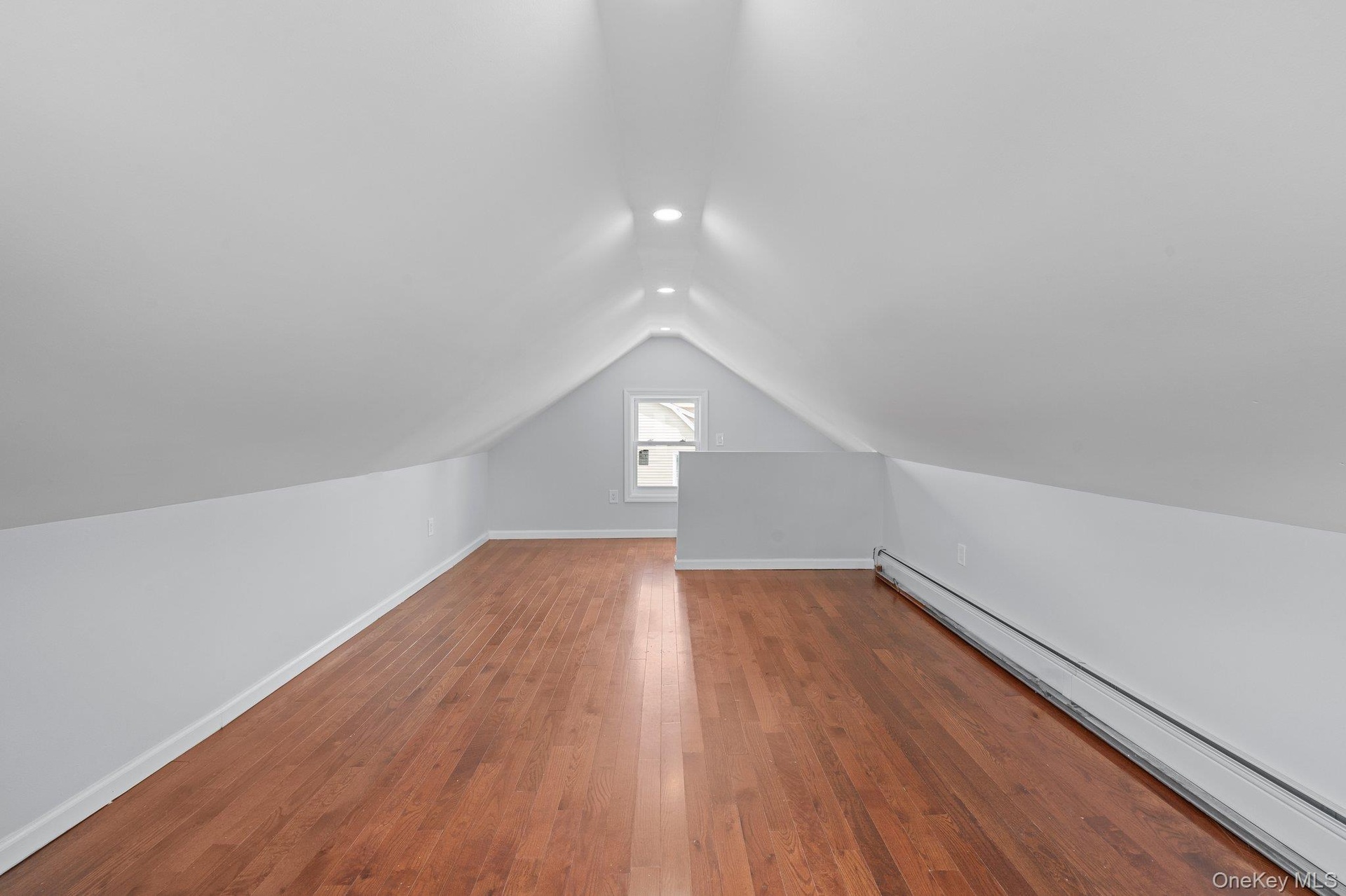 - Bonus room with a baseboard radiator, lofted ceiling, recessed lighting, and wood finished floors
