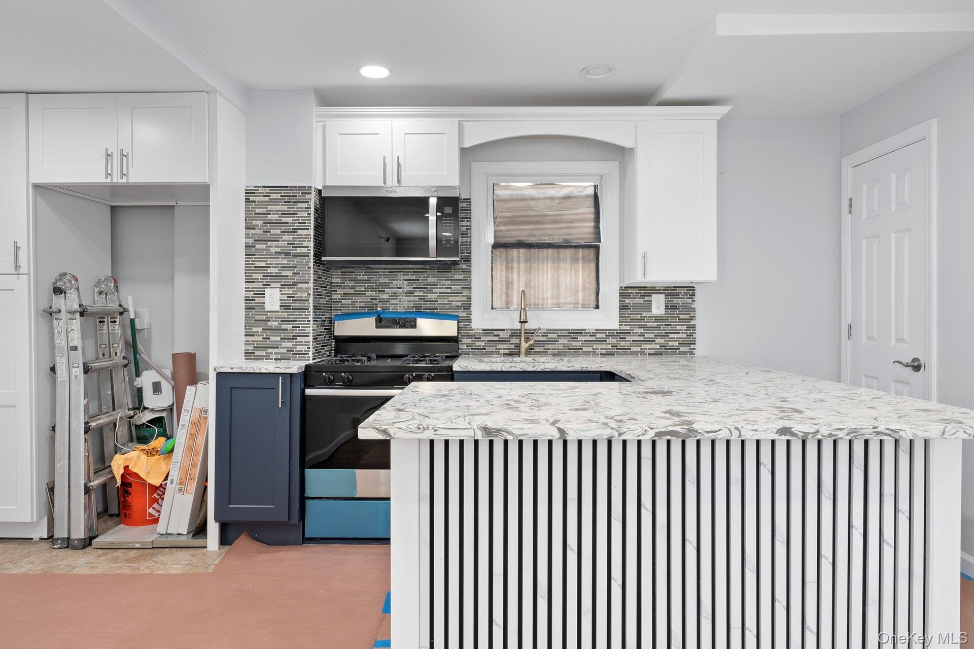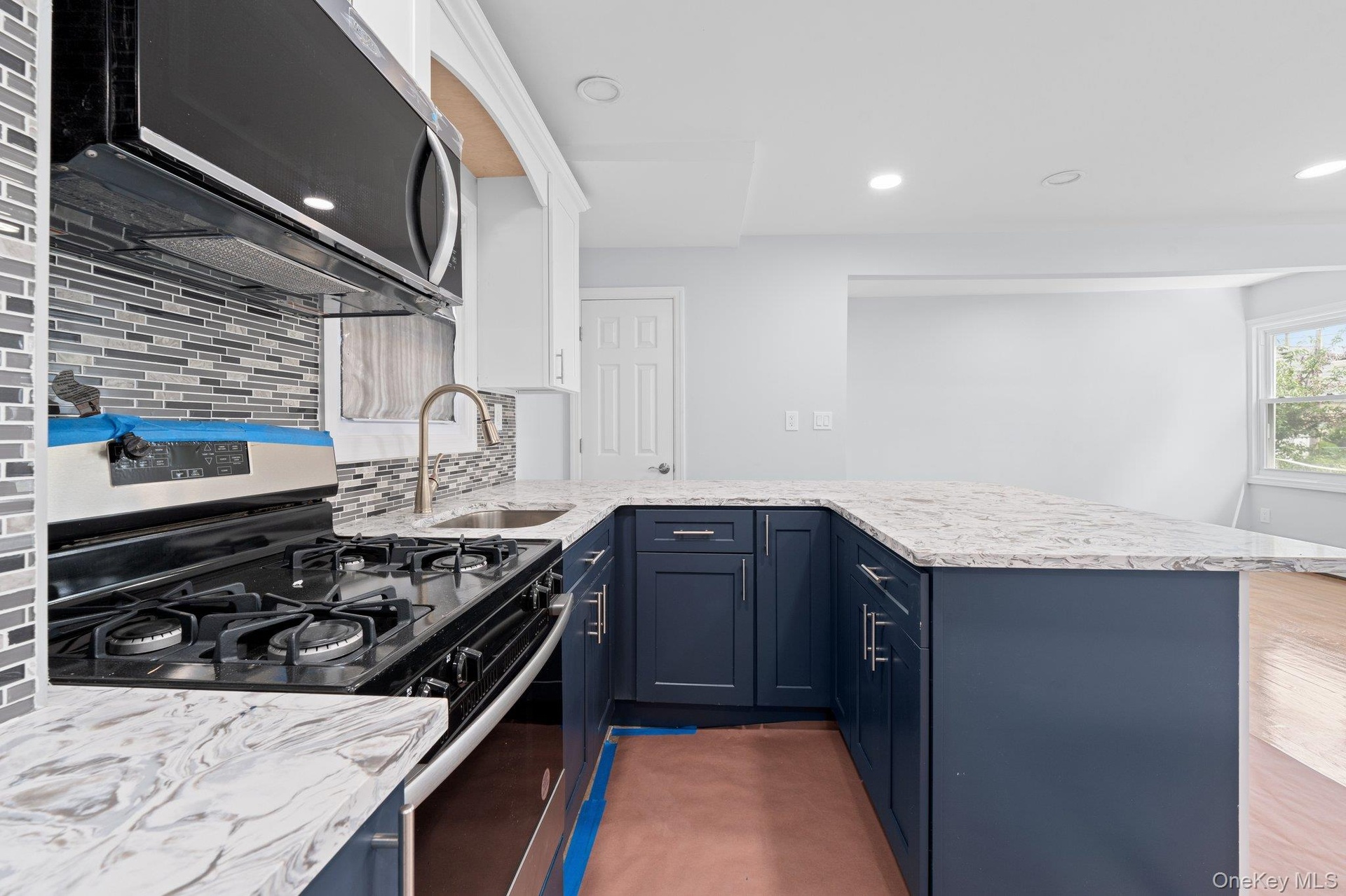 - Kitchen with stainless steel gas range, a peninsula, blue cabinets, backsplash, and recessed lighting