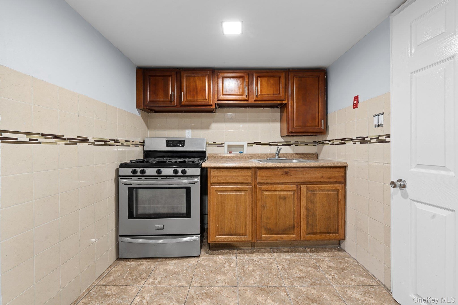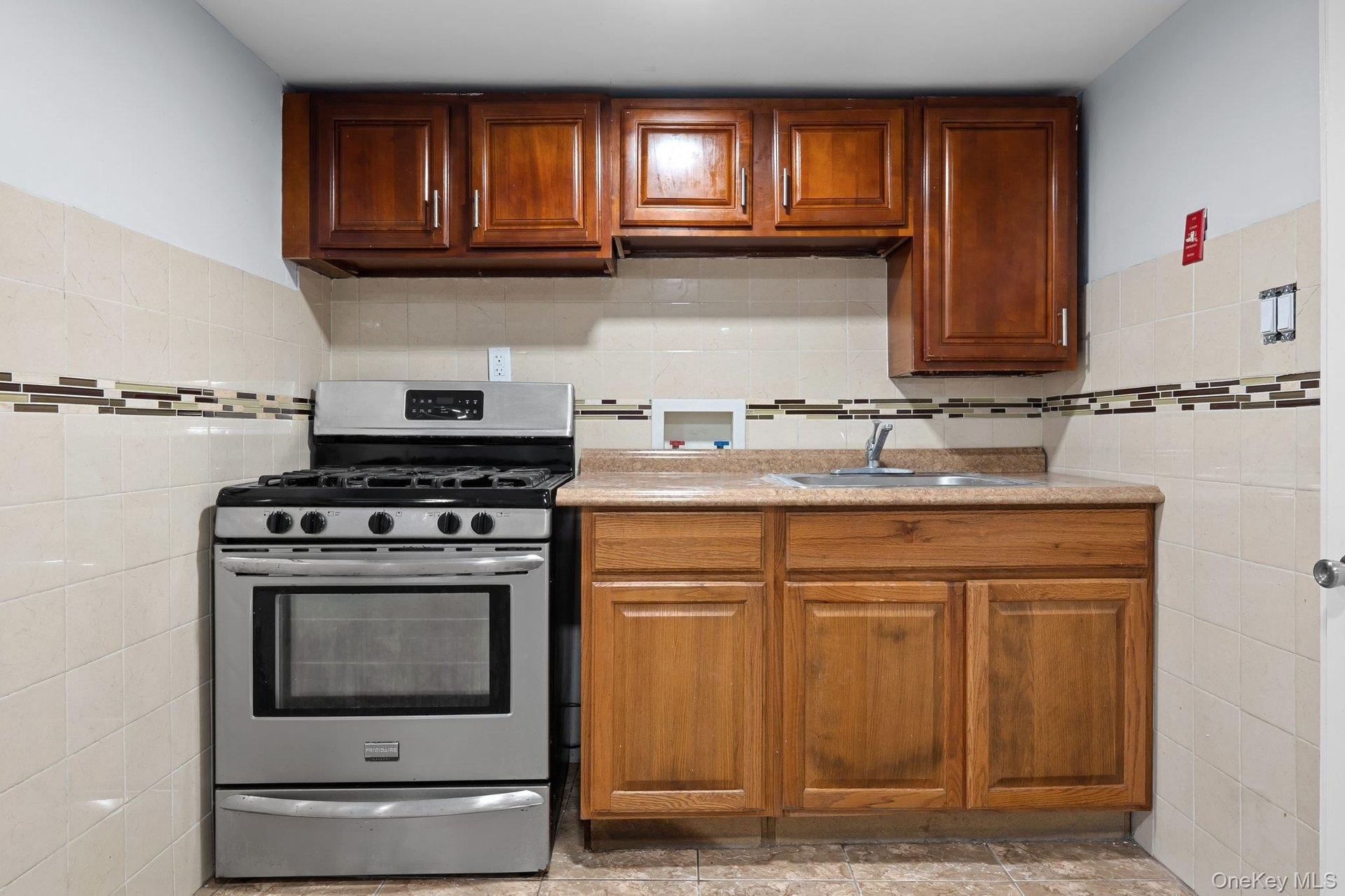- Kitchen featuring stainless steel gas range oven, tile walls, light countertops, and brown cabinets