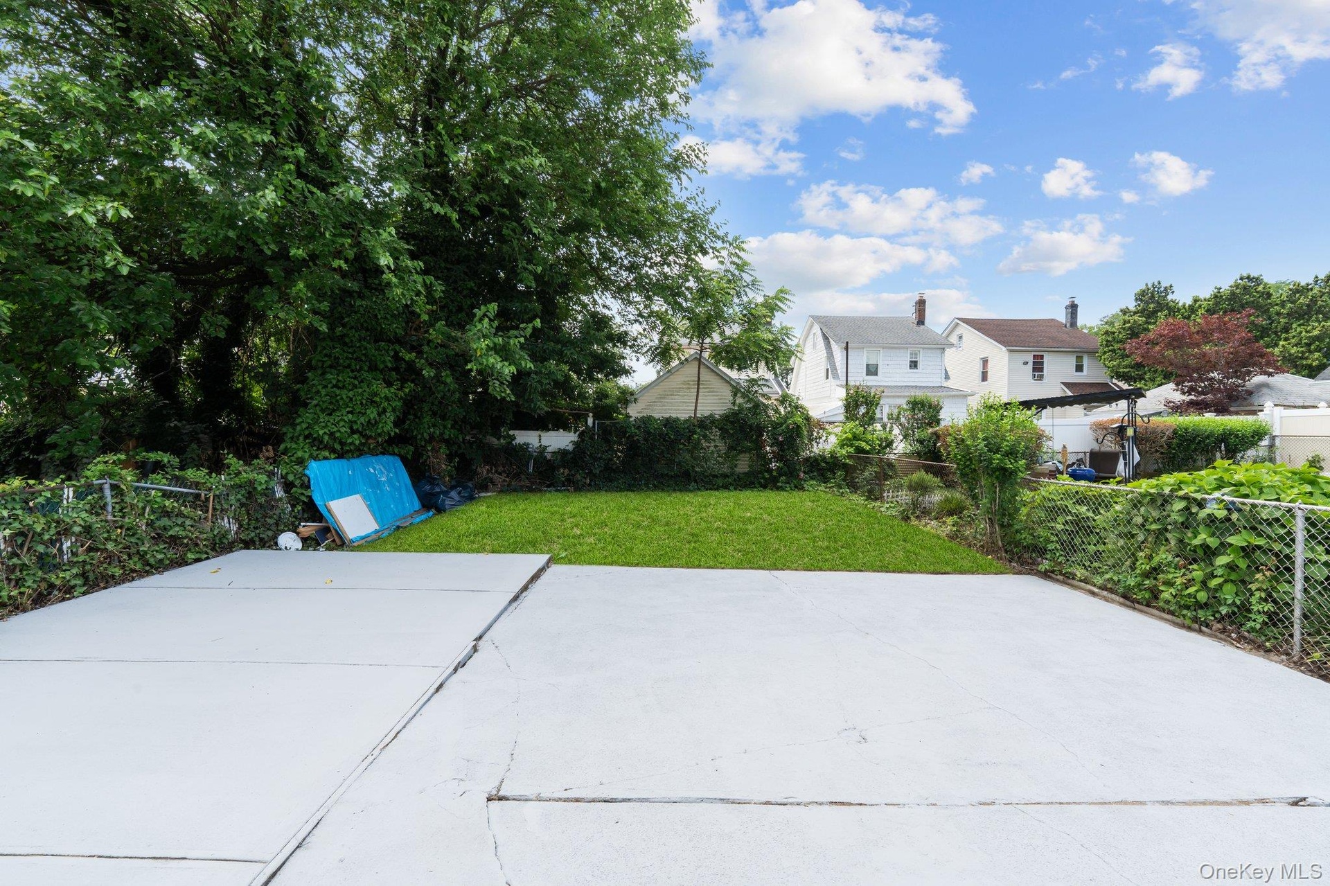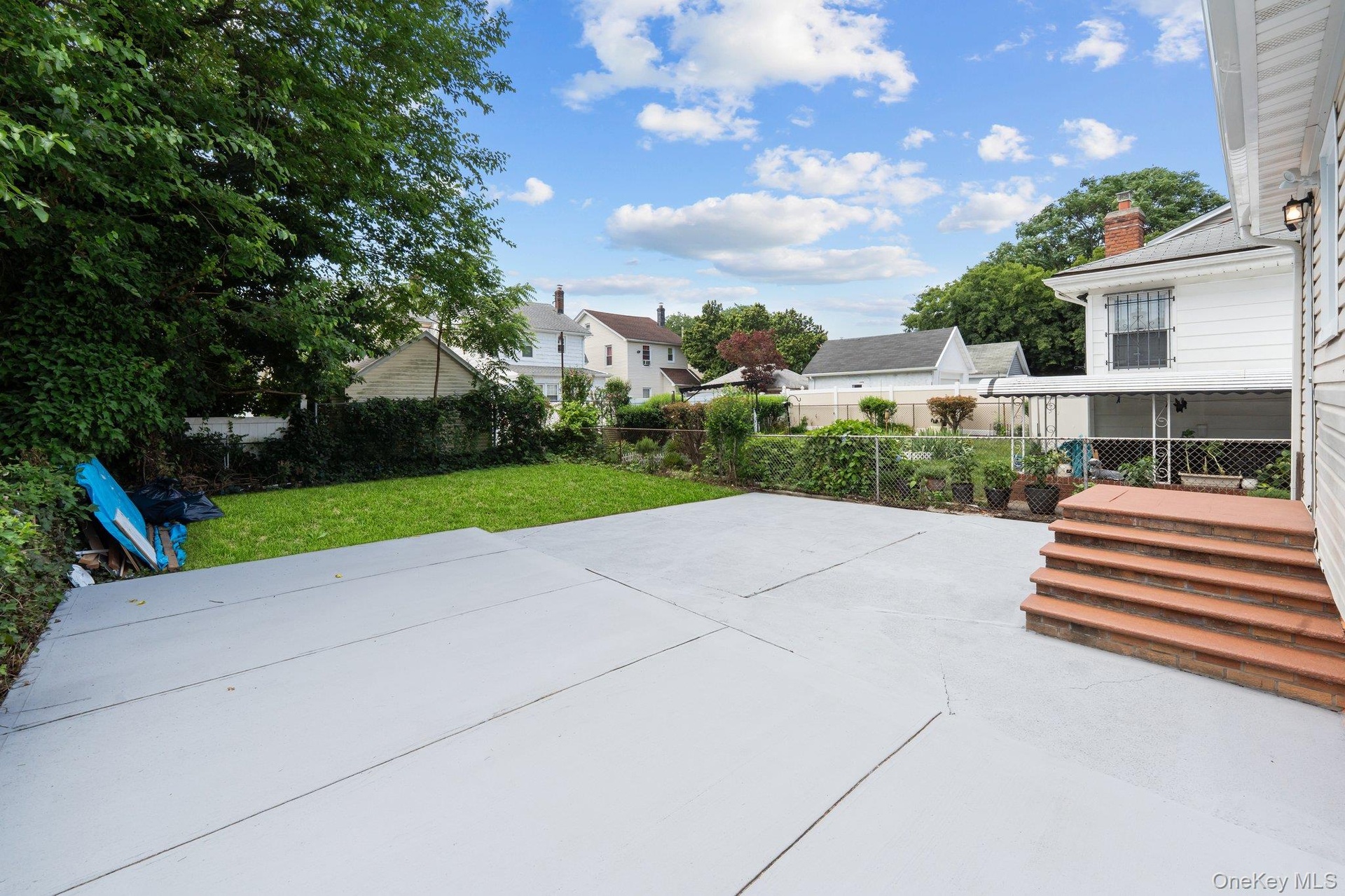 - Fenced backyard with a patio and a residential view
